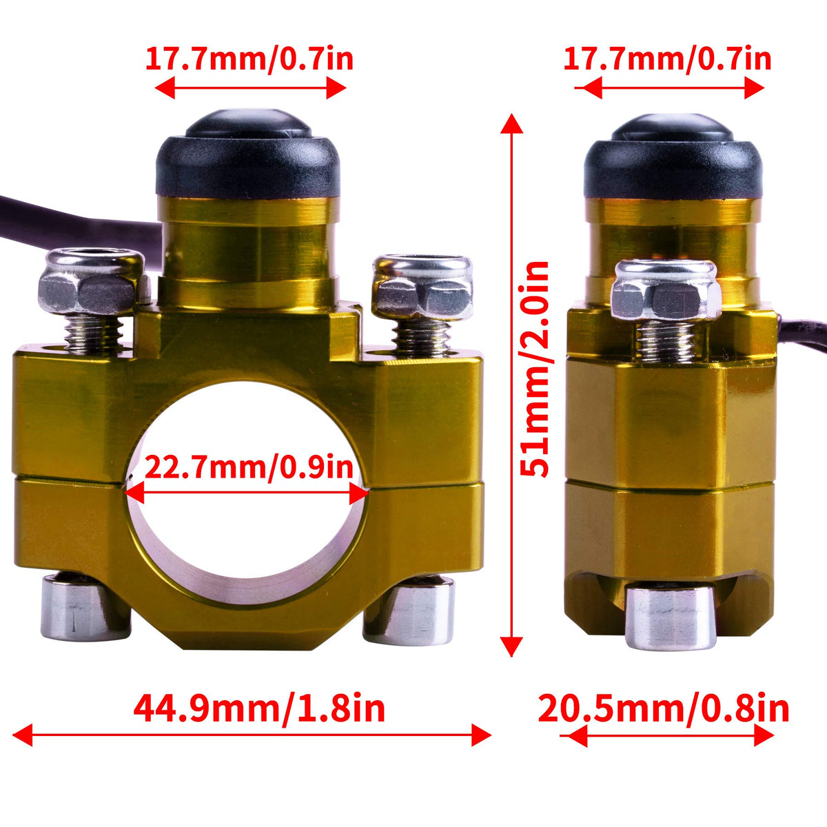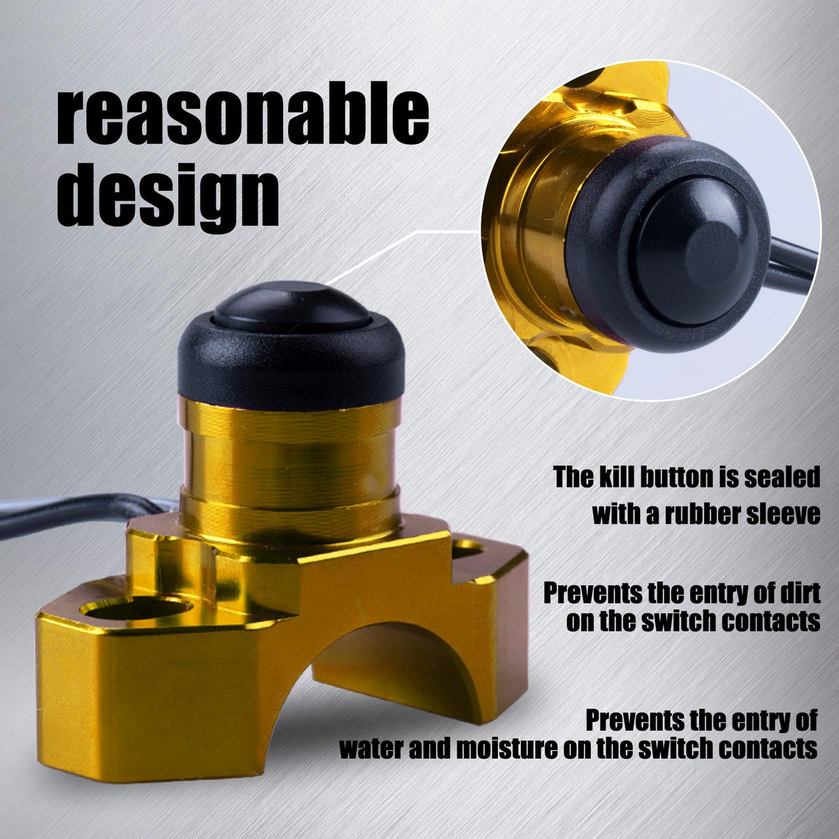 Universal CNC Billet kill switch for ATV,motorcycles,scooters ,quard etc with 22mm handlebars. Two Wires avaliable to use for kill or stop of engine(only for kill or only for stop,not for both of them). The housing is CNC machined from billet aluminum,same color of top and bottom plate. The kill button is sealed with rubber boot around it,keeps out dirt,water,and moisture from the switch contacts. Sold with bottom housing clamp plate,really upgrade from old design without it and you can install it wherever you wanna.