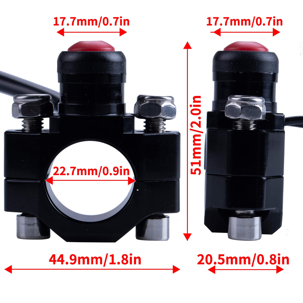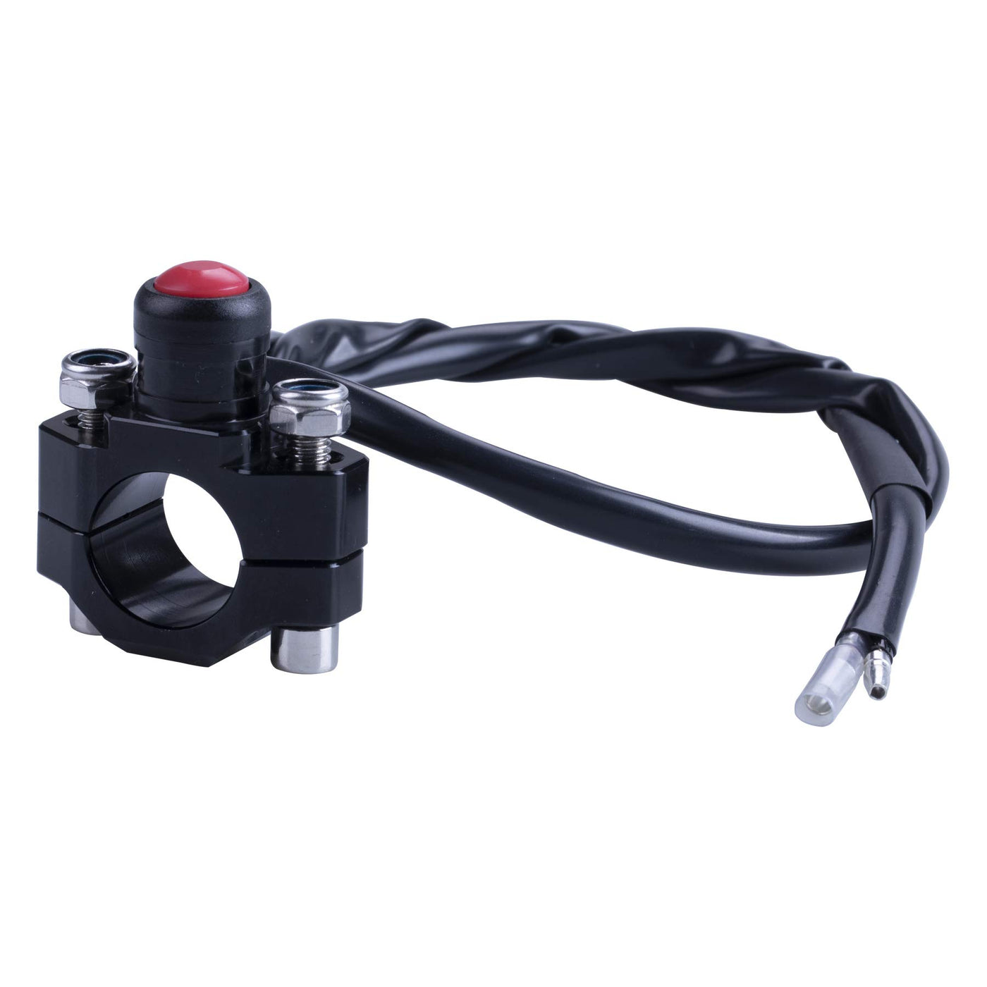 Universal CNC Billet kill switch for ATV,motorcycles,scooters ,quard etc with 22mm handlebars. Two Wires avaliable to use for kill or stop of engine(only for kill or only for stop,not for both of them). The housing is CNC machined from billet aluminum,same color of top and bottom plate. The kill button is sealed with rubber boot around it,keeps out dirt,water,and moisture from the switch contacts. Sold with bottom housing clamp plate,really upgrade from old design without it and you can install it wherever you wanna.