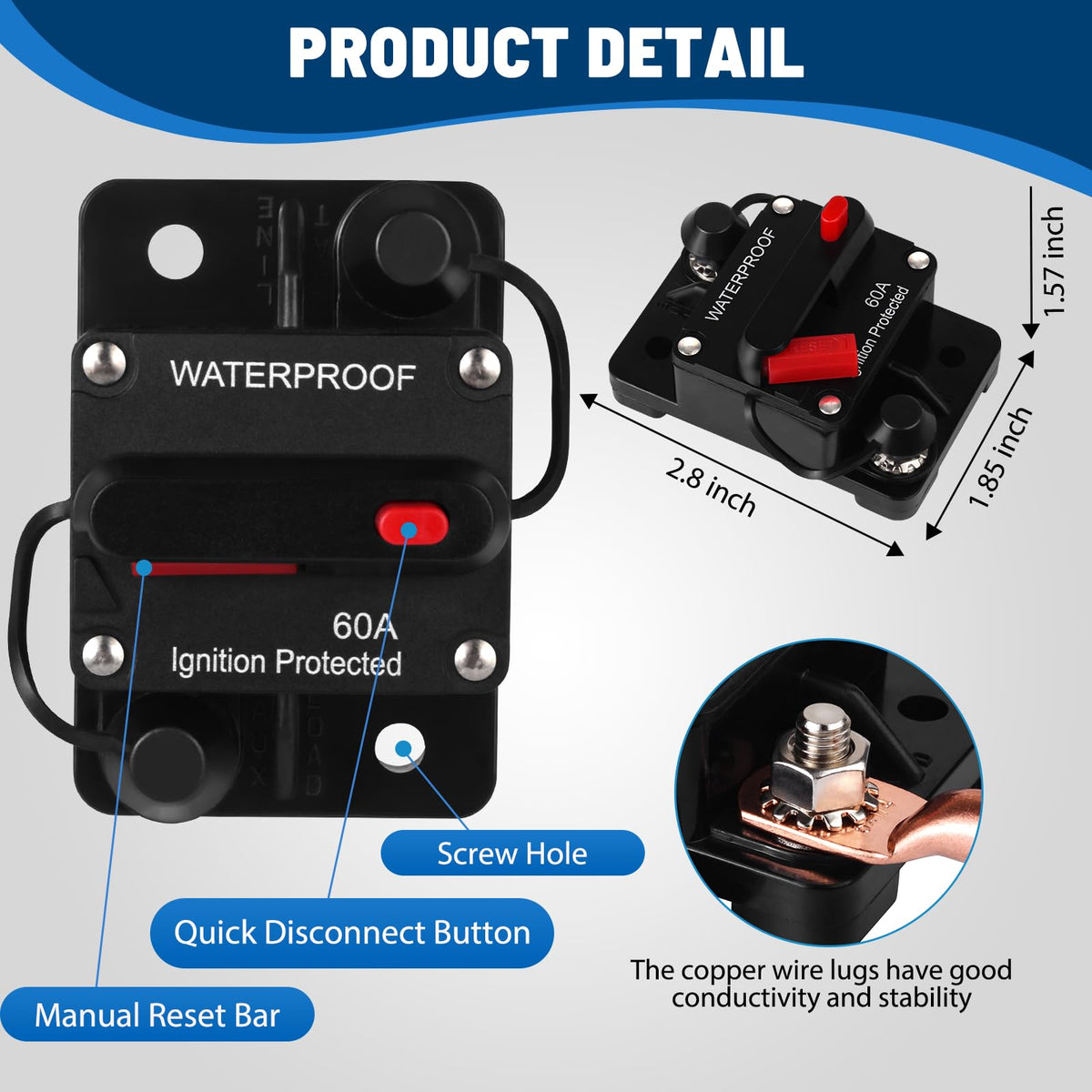 Ozikutech 60 Amp Circuit Breaker Dc 12V 24V 48V Manual Reset Switch For Trolling Motor Marine Boat Battery Solar System