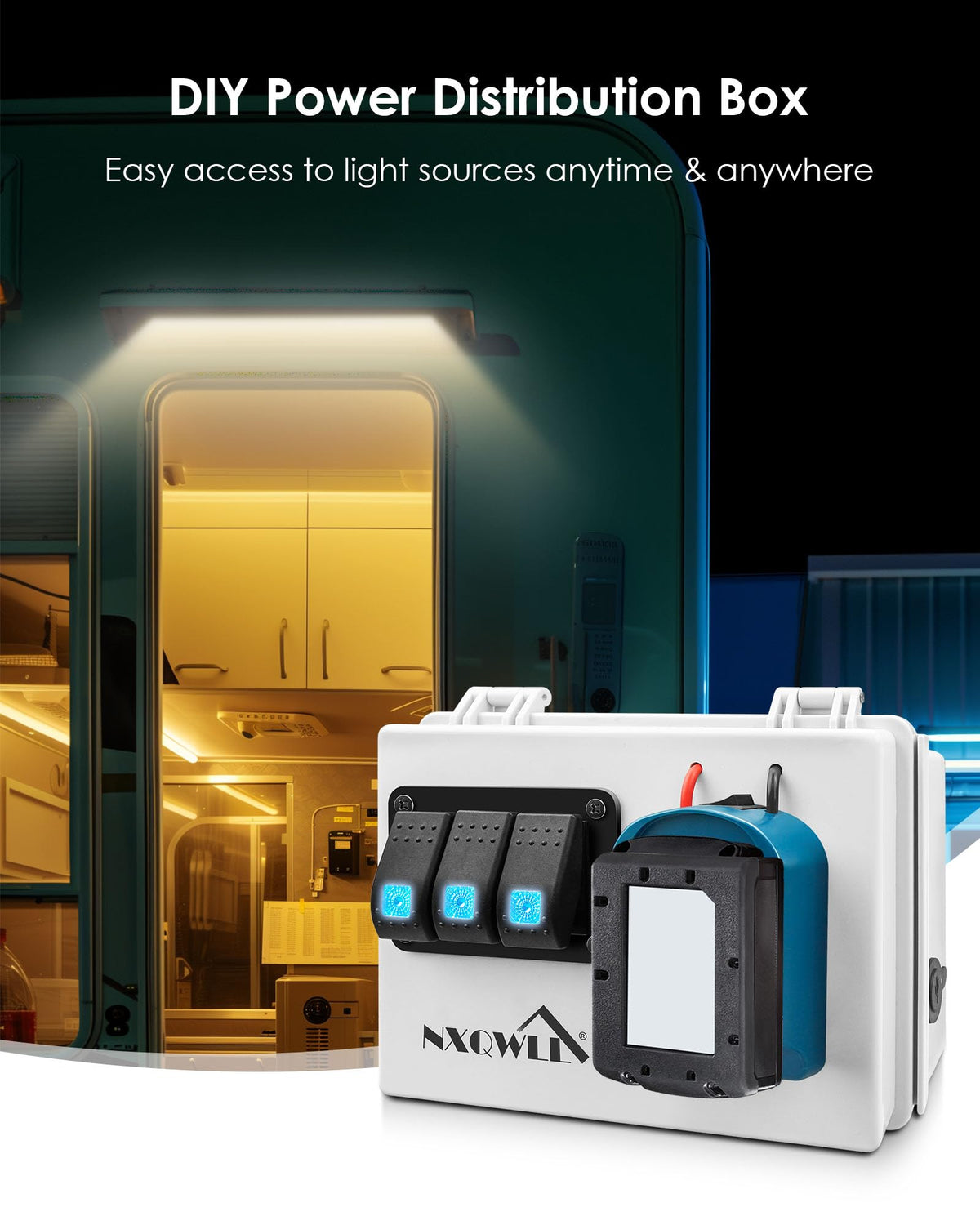 Unleash Convenience and Versatility with Our DIY Power Adapter BoxBy simply connecting your desired LED light lines to the power box and flicking the switch, you effortlessly harness light without relying on vehicle power. Embrace the freedom of accessing light anywhere, anytime, whether on your trailer or RV.Versatile Power for Every EndeavorEmbrace boundless possibilities with our multifunctional power box, tailor-made for outdoor escapades, camping trips, and remote travels. Suitable for RVs, trucks, yachts, and compact warehouses, it delivers reliable 12V power output, provide extra power for truck tail lights, enhancing safety during nocturnal drives, and catering to diverse equipment power needs.Seamless ControlExperience seamless control with pre-installed three-way switch circuits, empowering you to independently manage various devices and light fixtures. Designed to provide ample power, our box offers theoretical power duration calculations based on battery capacity and load power, ensuring optimal usage. For instance, a 110Wh battery can power ten 10W LED lights for eleven hours.Robust SecurityThe power box features 6-way fuse holders with included fuses, allowing for fuse size customization to shield wiring from overload and short circuit damage. Equipped with four mounting feet, it securely affixes to walls.Low Voltage ProtectionWith built-in low voltage protection, effortlessly tailor your battery's power level via intuitive key adjustments. When battery levels dip below your preset threshold, the system automatically cuts power, safeguarding your battery from harm while ensuring prolonged device and fixture stability.Dual USB Outputs for Added ConvenienceConvenience meets innovation with our dual 5V 2.1A USB output ports, facilitating simultaneous charging of mobile devices.