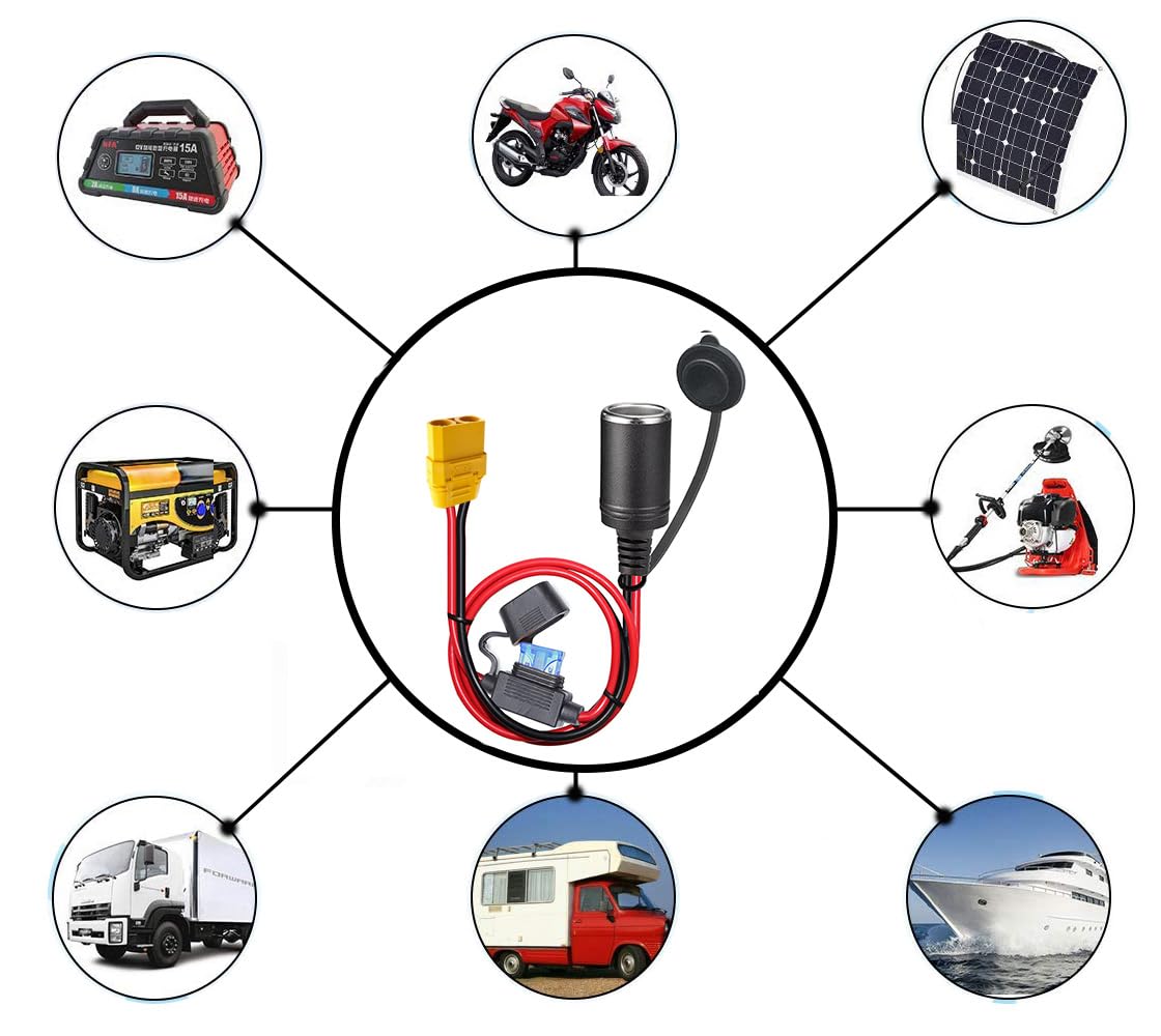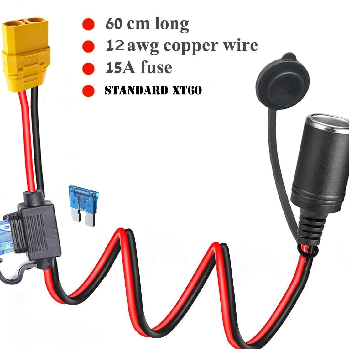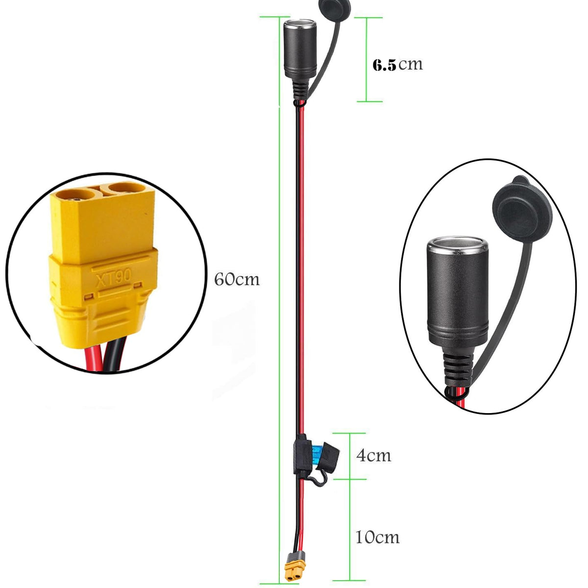 Specification:Female Plug to XT90 connectorXT90 connector To Female Plug Rated Current: 15AmpsWire: SPT-2, 12AWG/2CColor: Red/BlackLength: 2FTFeature:1.Type: Female Plug toXT90 Terminal Harness.2.Black (Negative) and Red (Positive) with 15 amp in line fuse.3.Fast and easy to connect and disconnect, you can to install on your battery for quick connection to the battery maintainer.4.With waterproof dust cover - protect the Female Plug port from dust and raindrop when you dont use it.5.Suitable for most of vehicle use, like Motorcycle, Bike, Lawn tractor, Truck, Pickup, Snowmobile, Riding lawn mower, Boats, ATV, RV, Scooter, UTV, Kayak.Note:Please connect the positive pole of your device to the positive pole of the power supply. The color of the the wire is not used as a reference for the positive and negative poles.