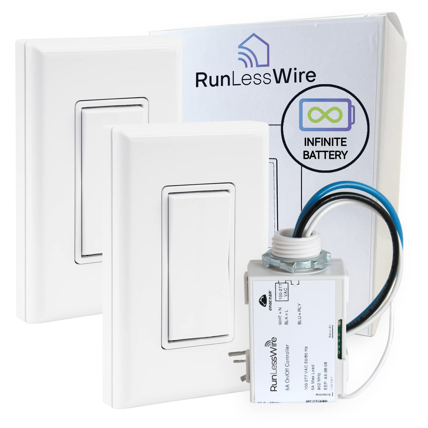 Many wireless switches are complicated and difficult to install. The RunLessWire 2-controller kit and light switch system are designed to be completely user friendly. Control your LED lights, ceiling- or wall-mounted fixtures, and other electronics as well as your ceiling fans with this kit, which includes a dual switch. There is no need for batteries or complicated wires for our light switches! Simply install using industrial tape or screws. Place it wherever it is convenient, or use it to replace an existing wired switch in your home. Receivers or controllers are wired between the power and the light and then stored adjacent to the junction box behind the fixture.Our electrical light switches are intended for indoor use. If you choose to install one of these switches for an outdoor light, it will need protection from the elements. You can use our kits to move a switch to a new location, add a wall switch to a pull-chain light, or add a switch anywhere else you'd like. Use this self-powered light switch in conjunction with controllers in a kit for lights, wall-mounted fixtures like sconces, and other electronics. It is important to note that the light switch is designed to control an unlimited number of linked controllers that are in range, and one controller can respond to up to 30 wireless remote light switches.RunLessWire is a trusted name in the wireless lighting control space, offering a variety of premium wireless lighting products that are incredibly simple to install and don't require complicated wiring or even batteries. Every RunLessWire product is user friendly, setting us apart as a leading brand for DIYers.