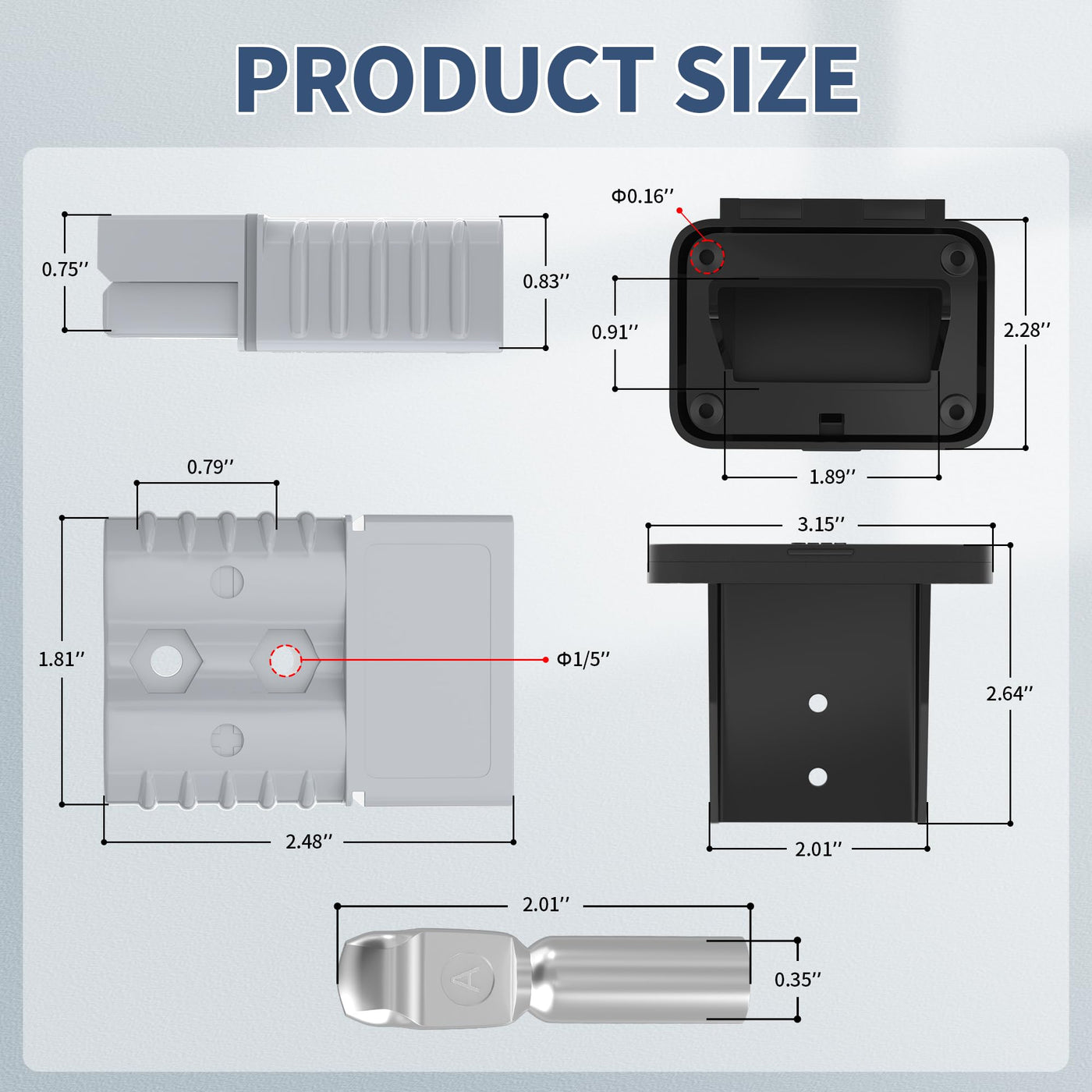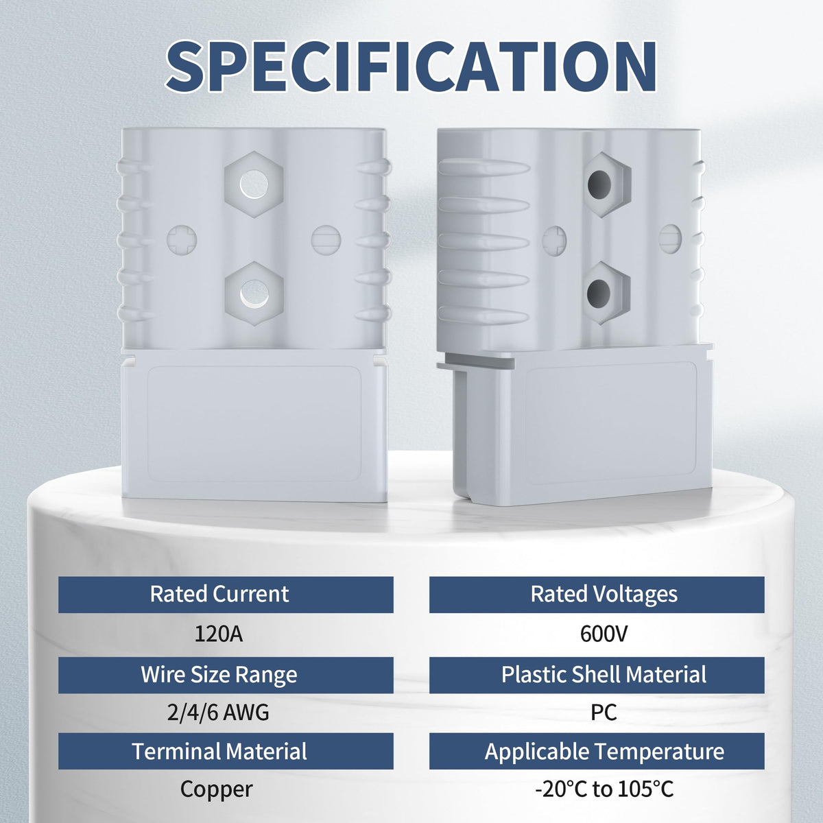 Product Information: This set of 120 Amp battery quick connect is suitable for 2/4/6 gauge cable; voltage: 600V; capacity:120A What You Get: The quick disconnect battery connector includes 4x housing, 2 x protect cover, 2 x mounting panel, 8 x terminals, 8 x mounting screws and 4 x fix screws Mounting Bracket: Flush mount bracket fits the 120A battery cable connector for installation in your dashboard, panel and case Product of Quality : The battery quick connector is made of solid PC flame retardant material. The terminal pin adopts copper silver plating, which has good conductivity and ensures stable voltage and current, high temperature resistant, corrosion resistant Wide Application: Winch quick disconnect cable kit used for truck, ATV, RV, elevato, crane, boat and trailer