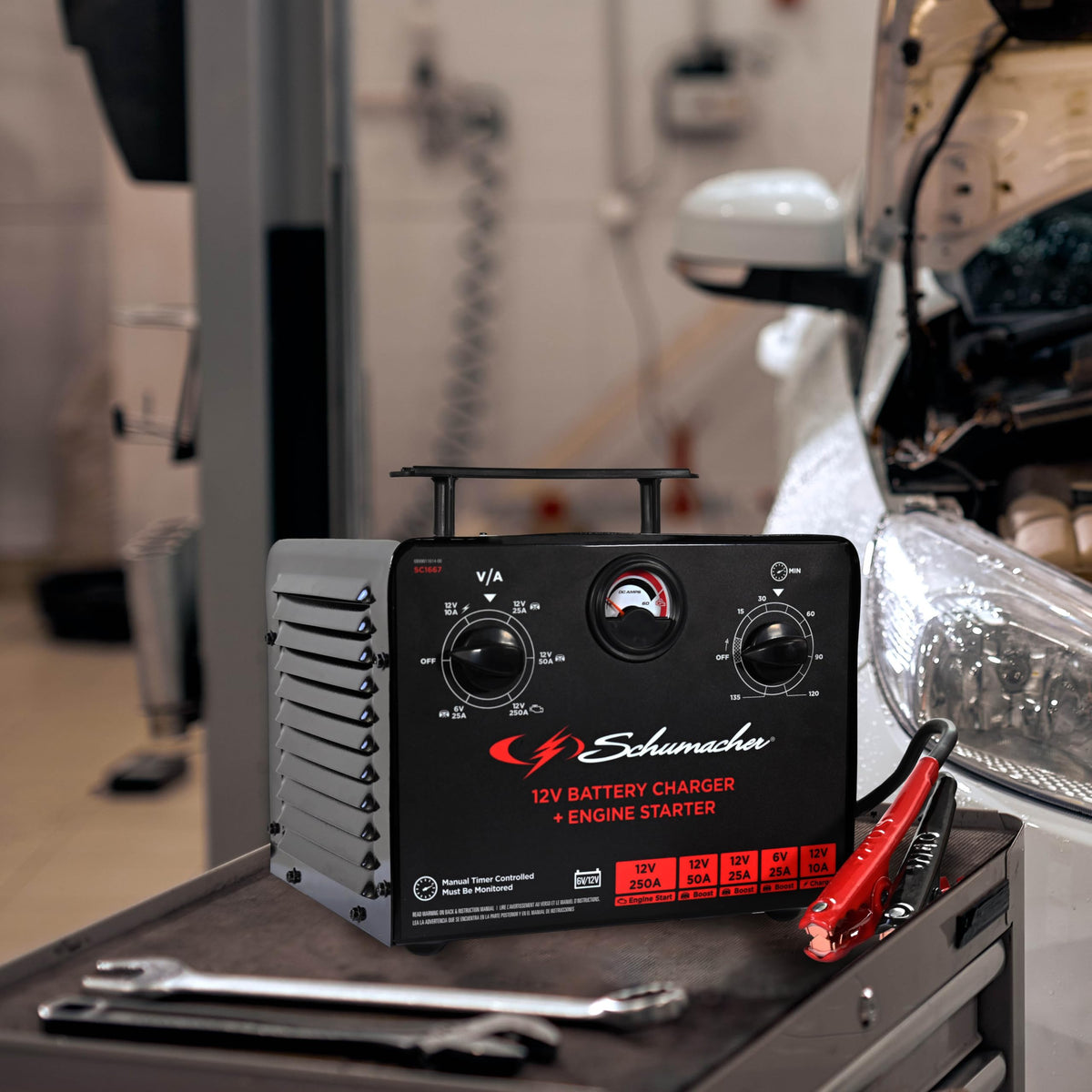 The Schumacher SC1667 250A 6V/12V Timer-Controlled Battery Charger and Jump Starter is the perfect choice for home mechanics who prefer to have complete control over their charging process. This versatile tool allows you to set a 135-minute timer, ensuring complete control over every aspect of the charging process. With multiple charging options, the SC1667 is equipped with a 250 cranking amp (12V) engine start, making it strong enough to jump start cars, SUVs, trucks, RVs, and other large engines. Additionally, the SC1667 offers three boost modes - 50A 12V, 25A 6V, and 25A 12V - perfect for adding a quick charge to deeply discharged batteries. The 10A 12V charge mode is ideal for basic battery charging and the SC1667 is compatible with most automobile battery types, including standard, AGM, and gel batteries. The SC1667 boasts a rugged metal casing, a sturdy handle, and 6-gauge output cables designed to remain flexible in cold weather. Color-coded clamps ensure easy and efficient connections. Choose the Schumacher SC1667 250A 6V/12V Timer-Controlled Battery Charger and Jump Starter for complete control and optimal charging performance when you need it most.