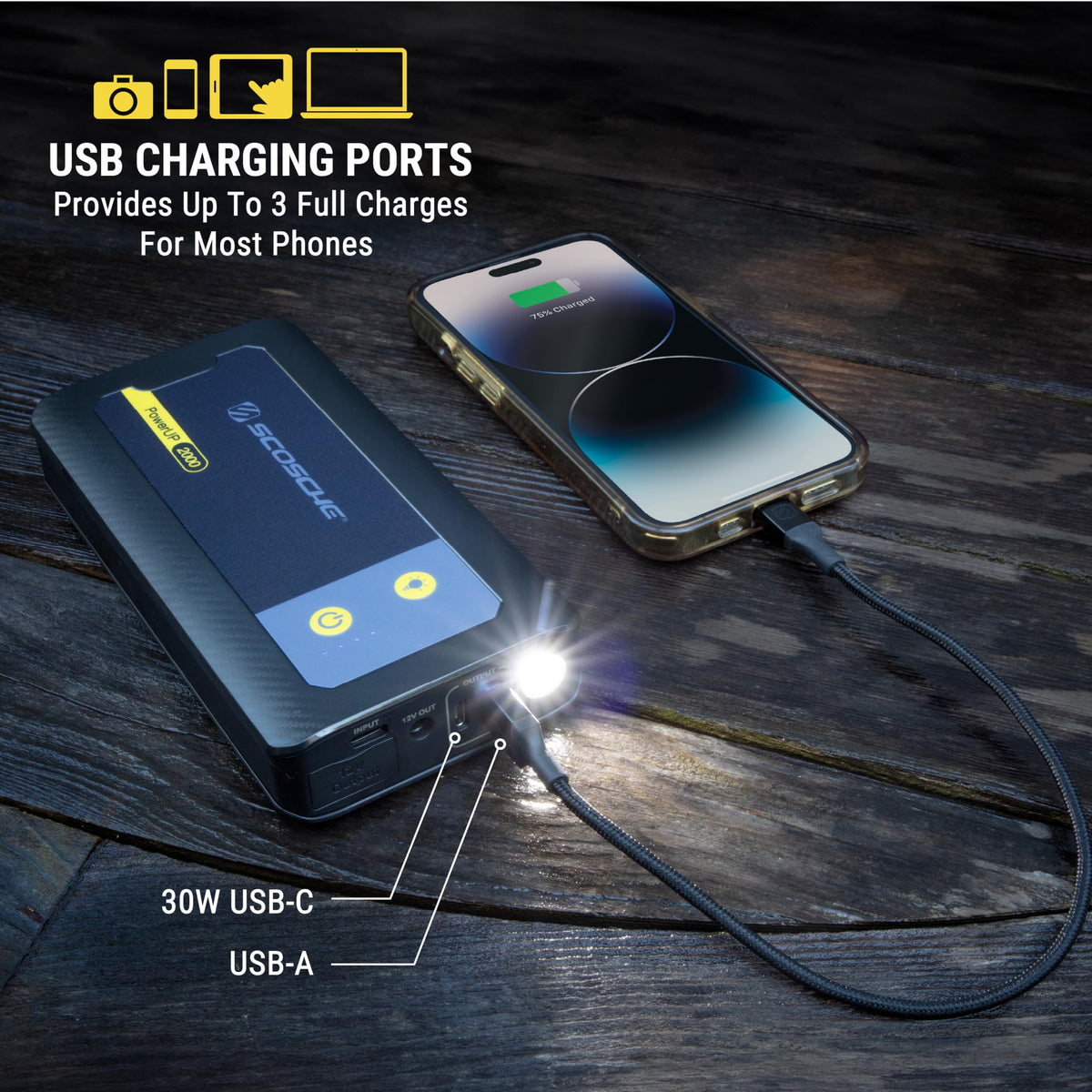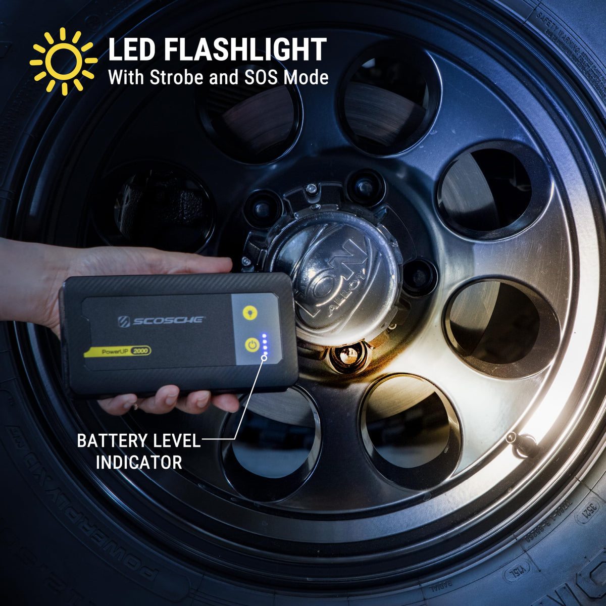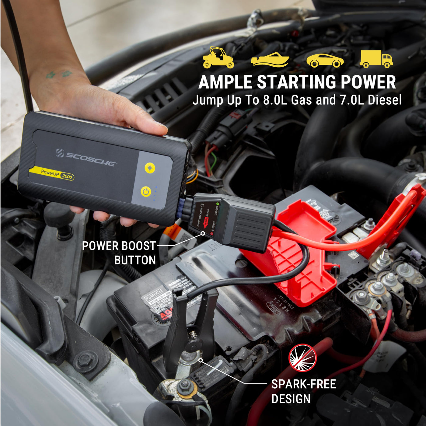 Jump Start Dead Batteries - With 2000 Peak Amps and a lithium-ion battery, this portable car jumper starter provides over 1,000 full charge cycles. The power boost from the Scosche jumper pack is capable of jump starting vehicles with gas engines up to 8.0 litre, and diesel engines up to 7.0 litre, even when the battery is completely drained. | Safety Features - Equipped with a 6-Point Spark-Free Safety System, our portable car jumper battery pack ensures that your car, truck, or any vehicle's battery is protected from overheating, overcurrent, overcharge, short circuits, and reverse connection. The Scosche jump starter, emergency roadside kit provides the peace of mind you need. | More Than a Jump Starter - Not only does the Scosche portable jump pack jumpstart your car but also charges phones, tablets, laptops and more. The battery jumper features a built-in power bank with a 30W USB-C PD charging port, ensuring you never find yourself stranded without a functioning cell phone when you need it most. | Emergency Flashlight - Equipped with a built-in bright LED flashlight that offers Strobe and SOS modes, and a battery level indicator, this jump pack is a reliable companion for car battery emergencies. Whether you're jump starting your car, or need emergency assistance, our portable car jump starter has you covered. | Compact and Durable - The rugged construction of our portable car battery charger and jump starter ensures years of reliable use. It's compact enough to fit in your glove compartment or trunk, and it comes with a carrying bag for easy storage and portability. | What's in the Box - Scosche PowerUp Jump Starter with Battery Jumper Cables & Clamps, Female 12V CLA, USB-A to USB-C Charging Cable, Carrying Bag, and Instruction Manual. Backed by Scosche