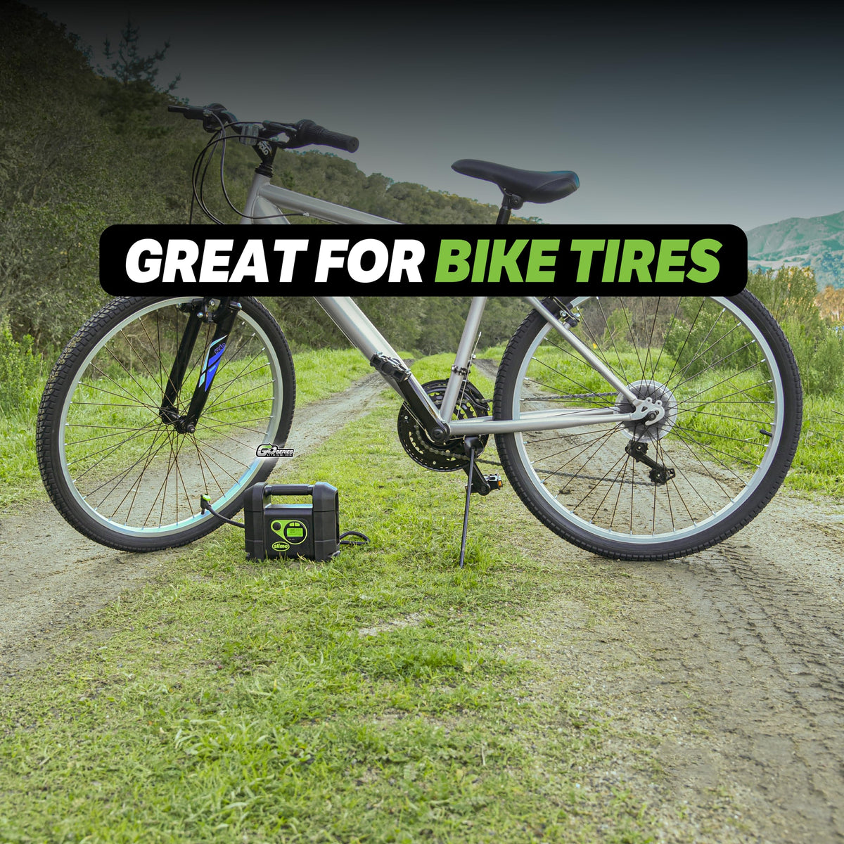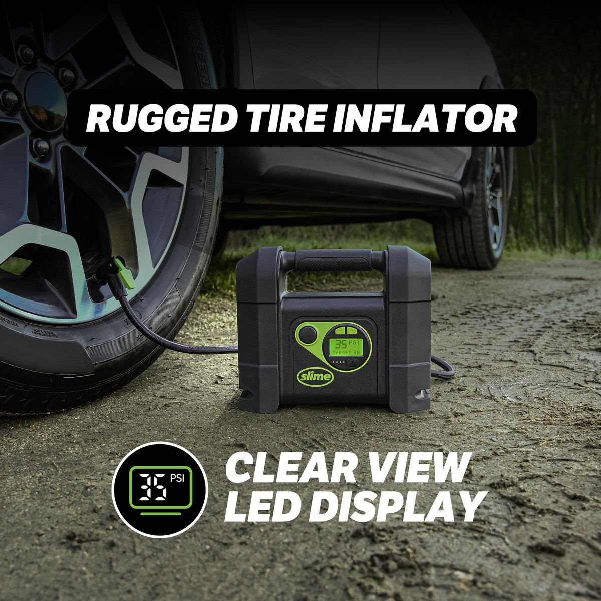 Air up anything, anywhere! Slime's Cordless Tire Inflator offers the most desired tire inflator features in one sleek, durable design. With a built-in Lithium Ion battery, a digital gauge with Inflate Right Technology (auto shut-off at set psi), very bright LED lights and a rubberized housing with solid base, the Slime Cordless Tire Inflator delivers both power and portability!