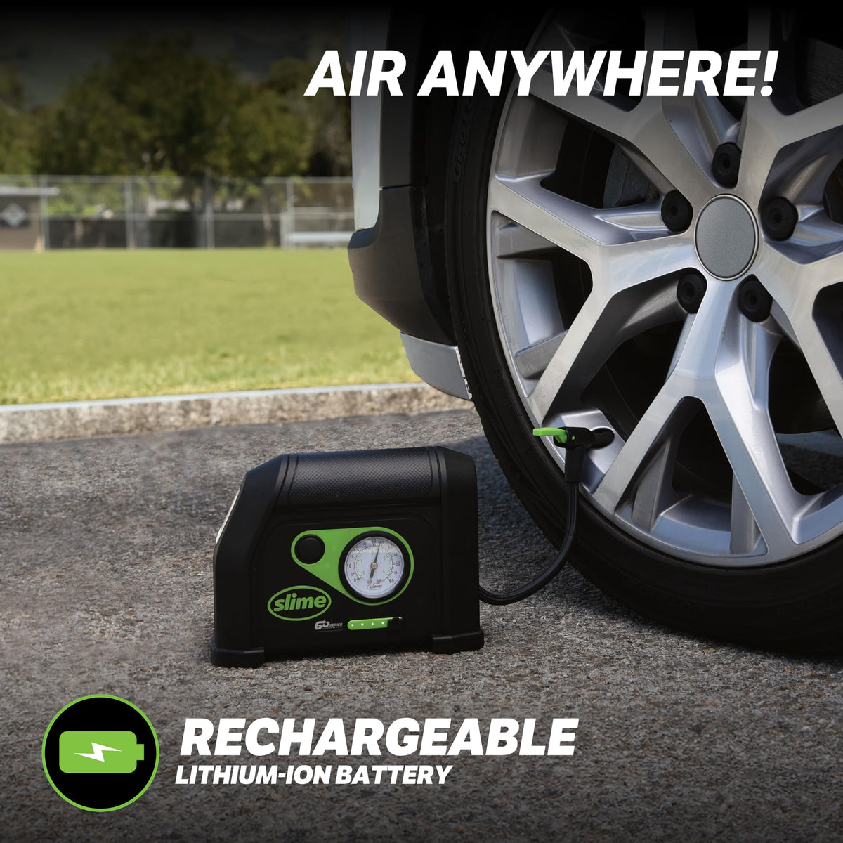 Slime 40084 Tire Inflator, Cordless, Portable Air Compressor Pump, Lithium Ion Battery and LED Light, Rechargeable, 8 min Inflat