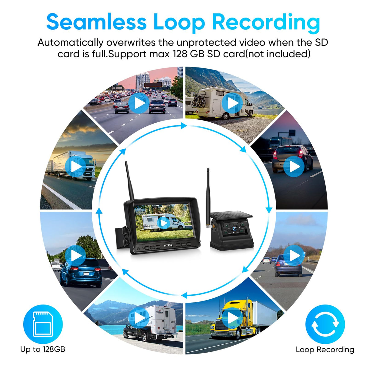 Q: What safety features does the backup camera offer?A: The backup camera includes built-in DVR loop recording, which automatically overwrites old footage while protecting video segments in the event of an accident. It also has IP69 waterproof rating, ensuring durability in various weather conditions.