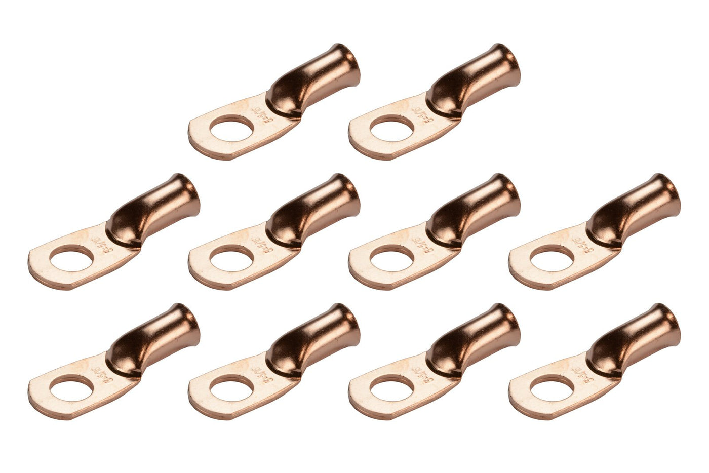 TEMCo bare copper battery cable ends are made from 99.91% pure copper (Lead and Mercury FREE), providing a high degree of conductivity for maximum current flow and designed with a heavy-duty construction for high temperature durability and enhanced mechanical strength. Terminal ends will not degrade in high temperature conditions. | Designed with a heavy-duty construction for high temperature durability and enhanced mechanical strength. Terminal ends will not degrade in high temperature conditions. | PRECISION FIT. High-tolerance dies are used in the molding process. Flared opening for easy wire insertion. | CLOSED END CONSTRUCTION keeps electrical components, batteries and cables safe and free from moisture, and prevents solder from leaking during installation. When paired with TEMCo adhesive heat shrink tubing will prevent corrosion by sealing out moisture. | Choose from a variety of wire sizes from 6 AWG to 4/0 AWG and stud sizes from