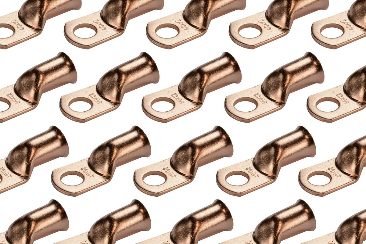 TEMCo bare copper battery cable ends are made from 99.91% pure copper (Lead and Mercury FREE), providing a high degree of conductivity for maximum current flow and designed with a heavy-duty construction for high temperature durability and enhanced mechanical strength. Terminal ends will not degrade in high temperature conditions. | Designed with a heavy-duty construction for high temperature durability and enhanced mechanical strength. Terminal ends will not degrade in high temperature conditions. | PRECISION FIT. High-tolerance dies are used in the molding process. Flared opening for easy wire insertion. | CLOSED END CONSTRUCTION keeps electrical components, batteries and cables safe and free from moisture, and prevents solder from leaking during installation. When paired with TEMCo adhesive heat shrink tubing will prevent corrosion by sealing out moisture. | Choose from a variety of wire sizes from 6 AWG to 4/0 AWG and stud sizes from