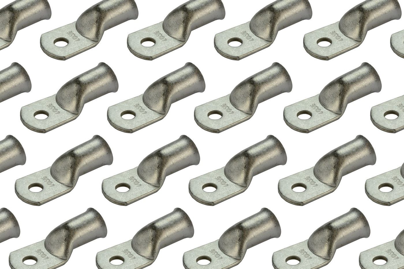 TEMCo Tinned Copper - marine grade battery cable ends are made from 99.91% annealed tinned pure copper (Lead and Mercury FREE), providing a high degree of conductivity for maximum current flow and designed with a heavy-duty construction for high temperature durability and enhanced mechanical strength. Terminal ends will not degrade in high temperature conditions. | PRECISION FIT. High-tolerance dies are used in the molding process. Flared opening for easy wire insertion. | CLOSED END CONSTRUCTION keeps electrical components, batteries and cables safe and free from moisture, and prevents solder from leaking during installation. When paired with TEMCo adhesive heat shrink tubing will prevent corrosion by sealing out moisture. | Tinned copper wire lugs are corrosion free; (Salt Spray certified to JISZ2371) ideal for marine, automotive or outdoor use. Special matte tin plating make these lugs easy to solder Designed for durability and rated for up to 600V DC when properly installed. | Choose from a variety of wire sizes from 6 AWG to 4/0 AWG and stud sizes from