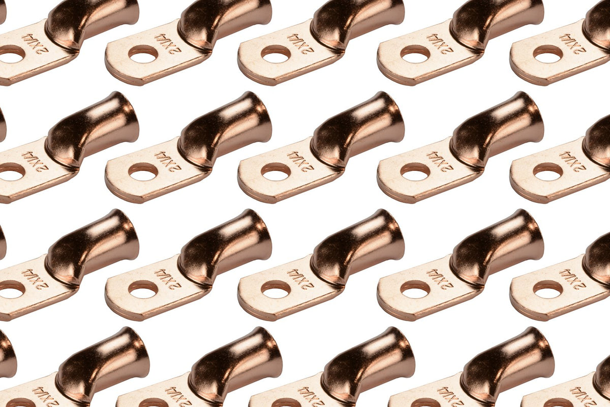 TEMCo bare copper battery cable ends are made from 99.91% pure copper (Lead and Mercury FREE), providing a high degree of conductivity for maximum current flow and designed with a heavy-duty construction for high temperature durability and enhanced mechanical strength. Terminal ends will not degrade in high temperature conditions. | Designed with a heavy-duty construction for high temperature durability and enhanced mechanical strength. Terminal ends will not degrade in high temperature conditions. | PRECISION FIT. High-tolerance dies are used in the molding process. Flared opening for easy wire insertion. | CLOSED END CONSTRUCTION keeps electrical components, batteries and cables safe and free from moisture, and prevents solder from leaking during installation. When paired with TEMCo adhesive heat shrink tubing will prevent corrosion by sealing out moisture. | Choose from a variety of wire sizes from 6 AWG to 4/0 AWG and stud sizes from