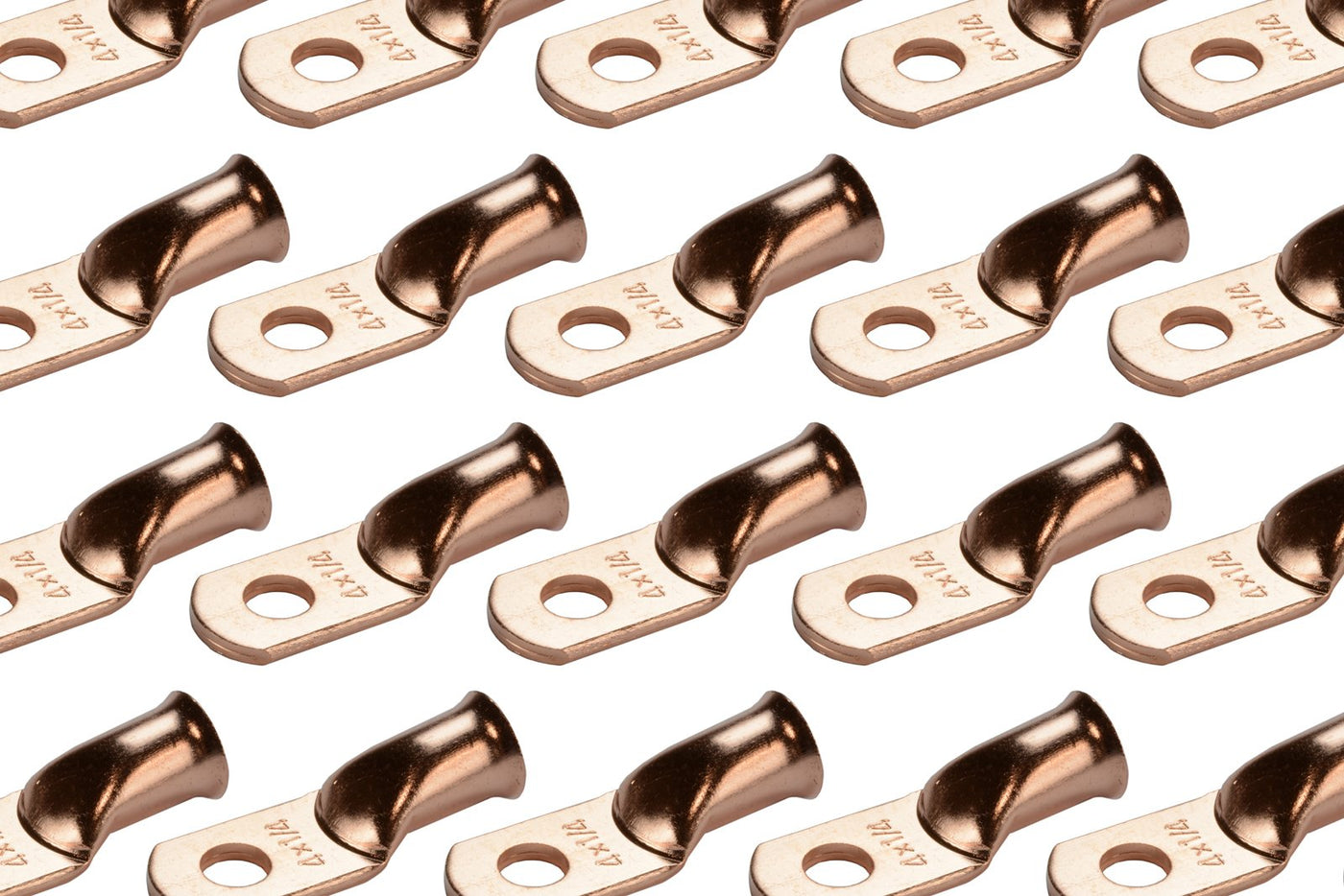 TEMCo bare copper battery cable ends are made from 99.91% pure copper (Lead and Mercury FREE), providing a high degree of conductivity for maximum current flow and designed with a heavy-duty construction for high temperature durability and enhanced mechanical strength. Terminal ends will not degrade in high temperature conditions. | Designed with a heavy-duty construction for high temperature durability and enhanced mechanical strength. Terminal ends will not degrade in high temperature conditions. | PRECISION FIT. High-tolerance dies are used in the molding process. Flared opening for easy wire insertion. | CLOSED END CONSTRUCTION keeps electrical components, batteries and cables safe and free from moisture, and prevents solder from leaking during installation. When paired with TEMCo adhesive heat shrink tubing will prevent corrosion by sealing out moisture. | Choose from a variety of wire sizes from 6 AWG to 4/0 AWG and stud sizes from