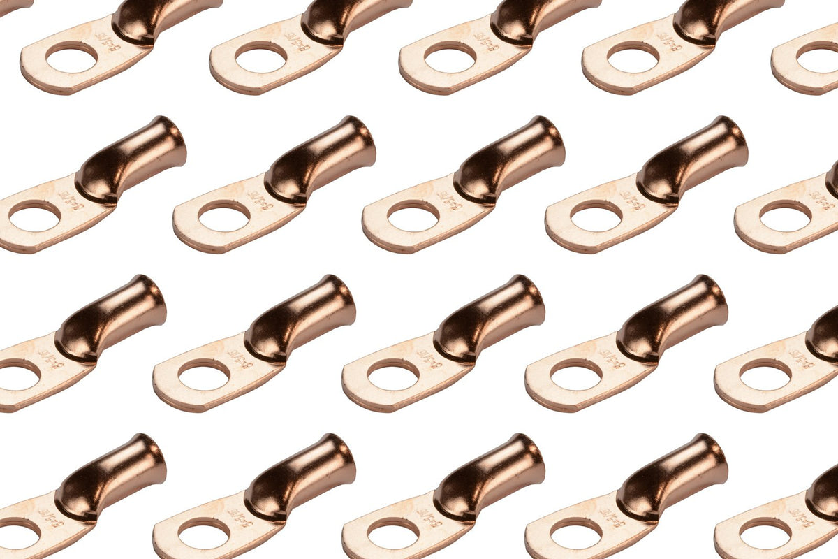TEMCo bare copper battery cable ends are made from 99.91% pure copper (Lead and Mercury FREE), providing a high degree of conductivity for maximum current flow and designed with a heavy-duty construction for high temperature durability and enhanced mechanical strength. Terminal ends will not degrade in high temperature conditions. | Designed with a heavy-duty construction for high temperature durability and enhanced mechanical strength. Terminal ends will not degrade in high temperature conditions. | PRECISION FIT. High-tolerance dies are used in the molding process. Flared opening for easy wire insertion. | CLOSED END CONSTRUCTION keeps electrical components, batteries and cables safe and free from moisture, and prevents solder from leaking during installation. When paired with TEMCo adhesive heat shrink tubing will prevent corrosion by sealing out moisture. | Choose from a variety of wire sizes from 6 AWG to 4/0 AWG and stud sizes from