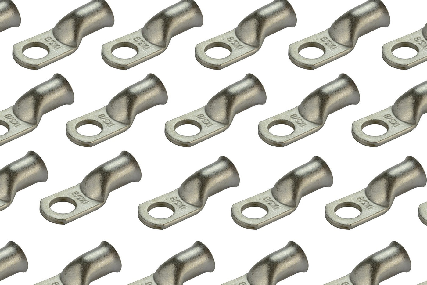 TEMCo Tinned Copper - marine grade battery cable ends are made from 99.91% annealed tinned pure copper (Lead and Mercury FREE), providing a high degree of conductivity for maximum current flow and designed with a heavy-duty construction for high temperature durability and enhanced mechanical strength. Terminal ends will not degrade in high temperature conditions. | PRECISION FIT. High-tolerance dies are used in the molding process. Flared opening for easy wire insertion. | CLOSED END CONSTRUCTION keeps electrical components, batteries and cables safe and free from moisture, and prevents solder from leaking during installation. When paired with TEMCo adhesive heat shrink tubing will prevent corrosion by sealing out moisture. | Tinned copper wire lugs are corrosion free; (Salt Spray certified to JISZ2371) ideal for marine, automotive or outdoor use. Special matte tin plating make these lugs easy to solder Designed for durability and rated for up to 600V DC when properly installed. | Choose from a variety of wire sizes from 6 AWG to 4/0 AWG and stud sizes from
