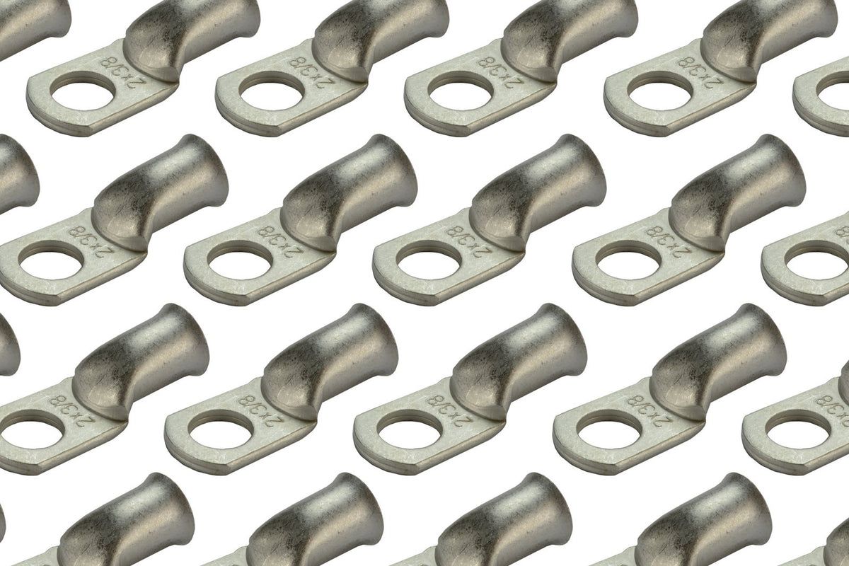 TEMCo Tinned Copper - marine grade battery cable ends are made from 99.91% annealed tinned pure copper (Lead and Mercury FREE), providing a high degree of conductivity for maximum current flow and designed with a heavy-duty construction for high temperature durability and enhanced mechanical strength. Terminal ends will not degrade in high temperature conditions. | PRECISION FIT. High-tolerance dies are used in the molding process. Flared opening for easy wire insertion. | CLOSED END CONSTRUCTION keeps electrical components, batteries and cables safe and free from moisture, and prevents solder from leaking during installation. When paired with TEMCo adhesive heat shrink tubing will prevent corrosion by sealing out moisture. | Tinned copper wire lugs are corrosion free; (Salt Spray certified to JISZ2371) ideal for marine, automotive or outdoor use. Special matte tin plating make these lugs easy to solder Designed for durability and rated for up to 600V DC when properly installed. | Choose from a variety of wire sizes from 6 AWG to 4/0 AWG and stud sizes from
