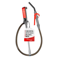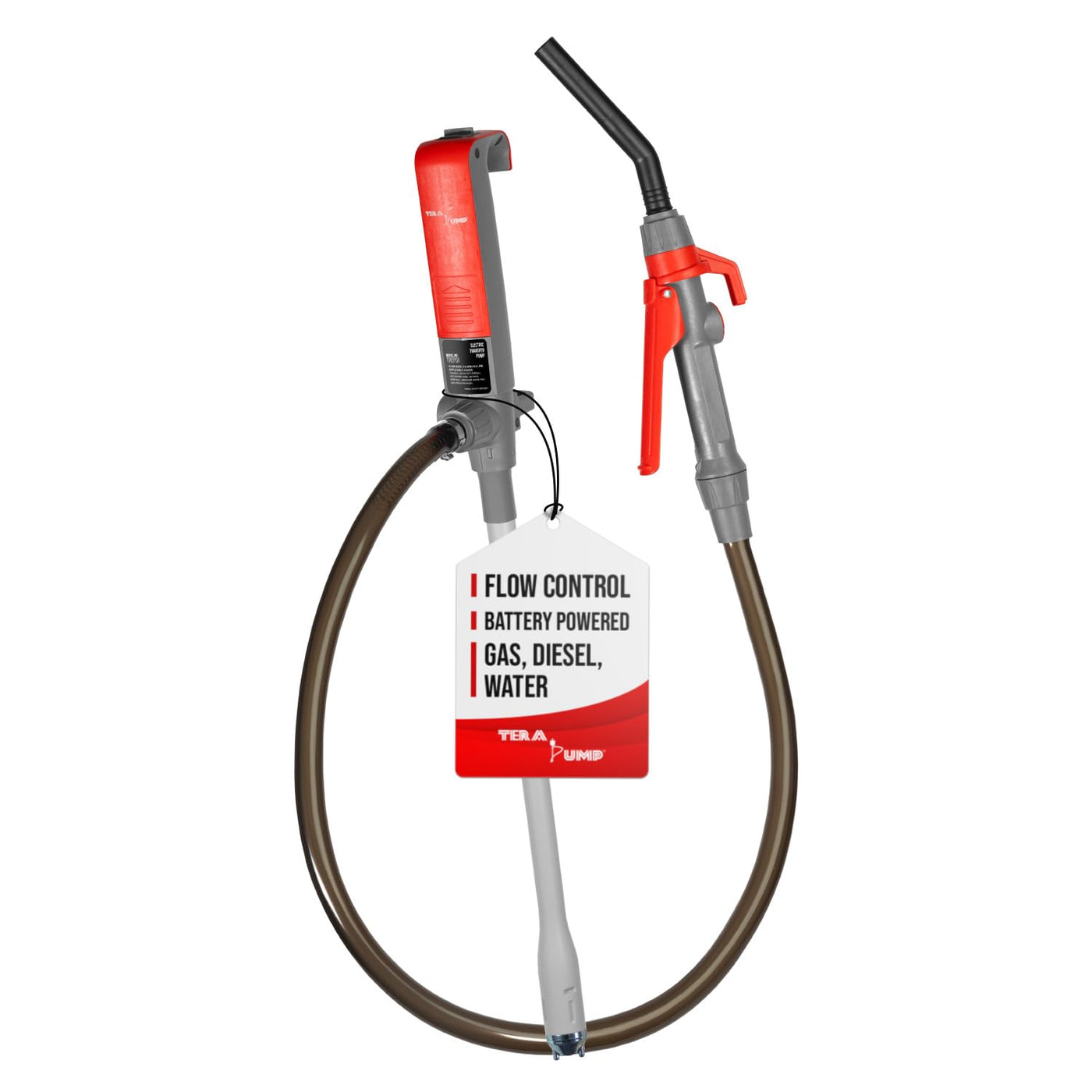 [ JAN 2025 UPGRADES ] Experience our new TREP01 with an upgraded 3.3 FT Discharge Hose made of Durable Vinyl for protection against minor nicks and cuts. Transfers up to 2.8 Gallons per Minute with Flow Control Nozzle. Control the flow by squeezing the nozzle lever, Lower Level Trigger Position is great for refueling gas, diesel and more & Upper lever trigger position is great for watering sessions. Nozzle can also be locked for longer watering or fueling sessions | [ RECOMMENDED ] Suitable for Gas, Diesel, DEF, Non-Potable Water, Kerosene, Antifreeze, Windshield Washer Fluid, & Agricultural Chemicals - Discharge Hose of 39.4-inch for refueling for farther distances - Discharge Hose Holder: Built-in nozzle holder for safe and convenient way of storing the discharge nozzle when not in use | [ SUCTION TUBE ] Suction Tube length of about 17.6-inch, Fits 3-Gallon (~11.4-Liters) Gas Cans, 5-Gallon (~19-Liters) Gas Can or up to 5-Gallon Pails - Suction end Outer Diameter: 1.2-inch - Swivel Nut Nozzle prevents hose from tangling with 360 degree rotation | [ BATTERY POWERED ] Powered with Two (D) Battery Powered, Sold Separately - Big Slide On/Off Switch - Works great with farm equipment, Industrial Vehicles and in Automotive Shops - U-Shaped battery compartment: U-shaped hook for easier storage | [ MANUFACTURER WARRANTY ] TERA PUMP has been manufacturing reliable pumps since 2005 and backs their product with a 1-Year Warranty on Manufacturer Defects - Replacement Motor Cap, Battery Cover & Nozzle (Sold Separately)