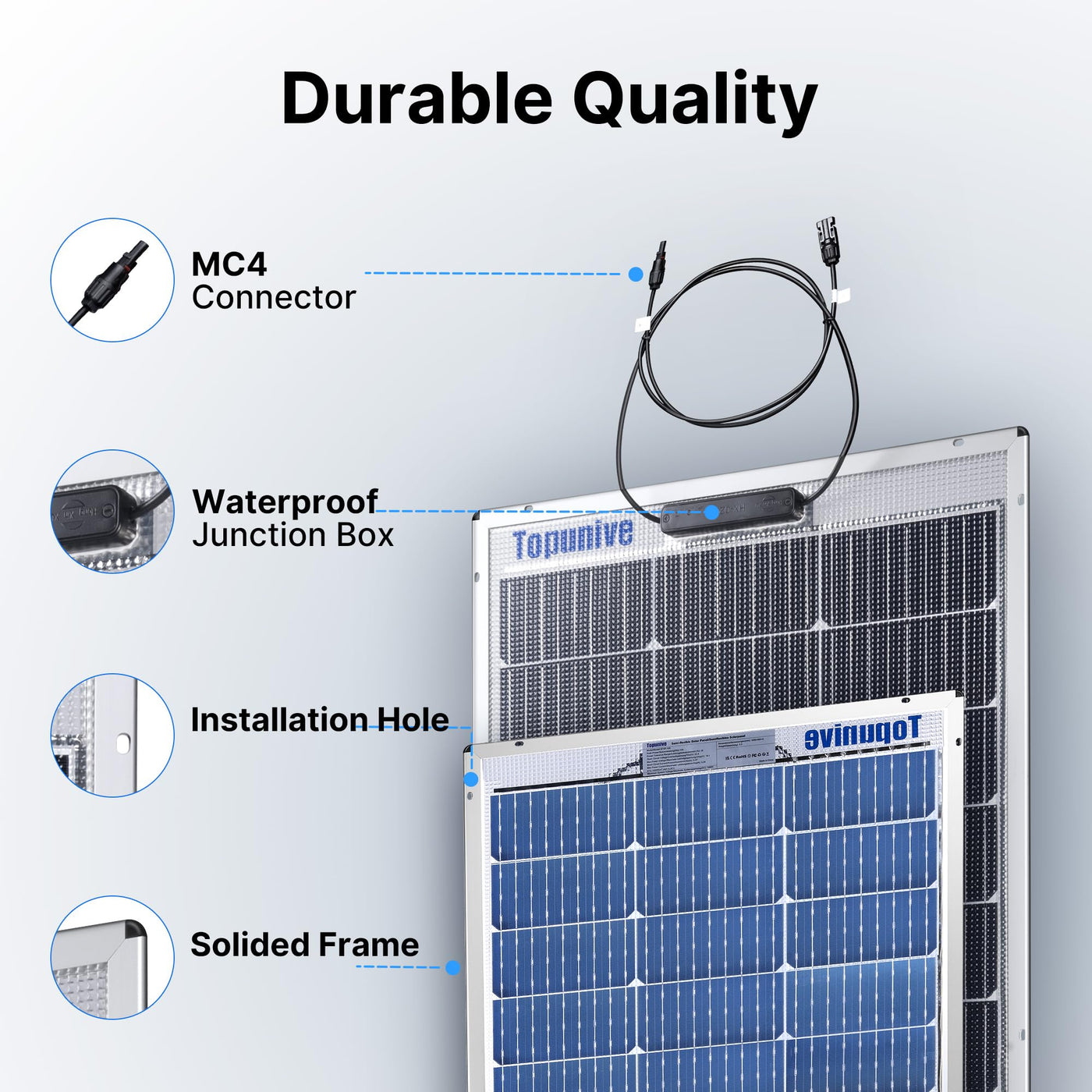 Q: Is the Topunive solar panel suitable for marine use?A: Yes, this solar panel is specifically designed for use in marine environments, making it ideal for boats, RVs, and trailers. Its durable construction and waterproof IP67-rated junction box ensure reliable performance even in challenging outdoor conditions.