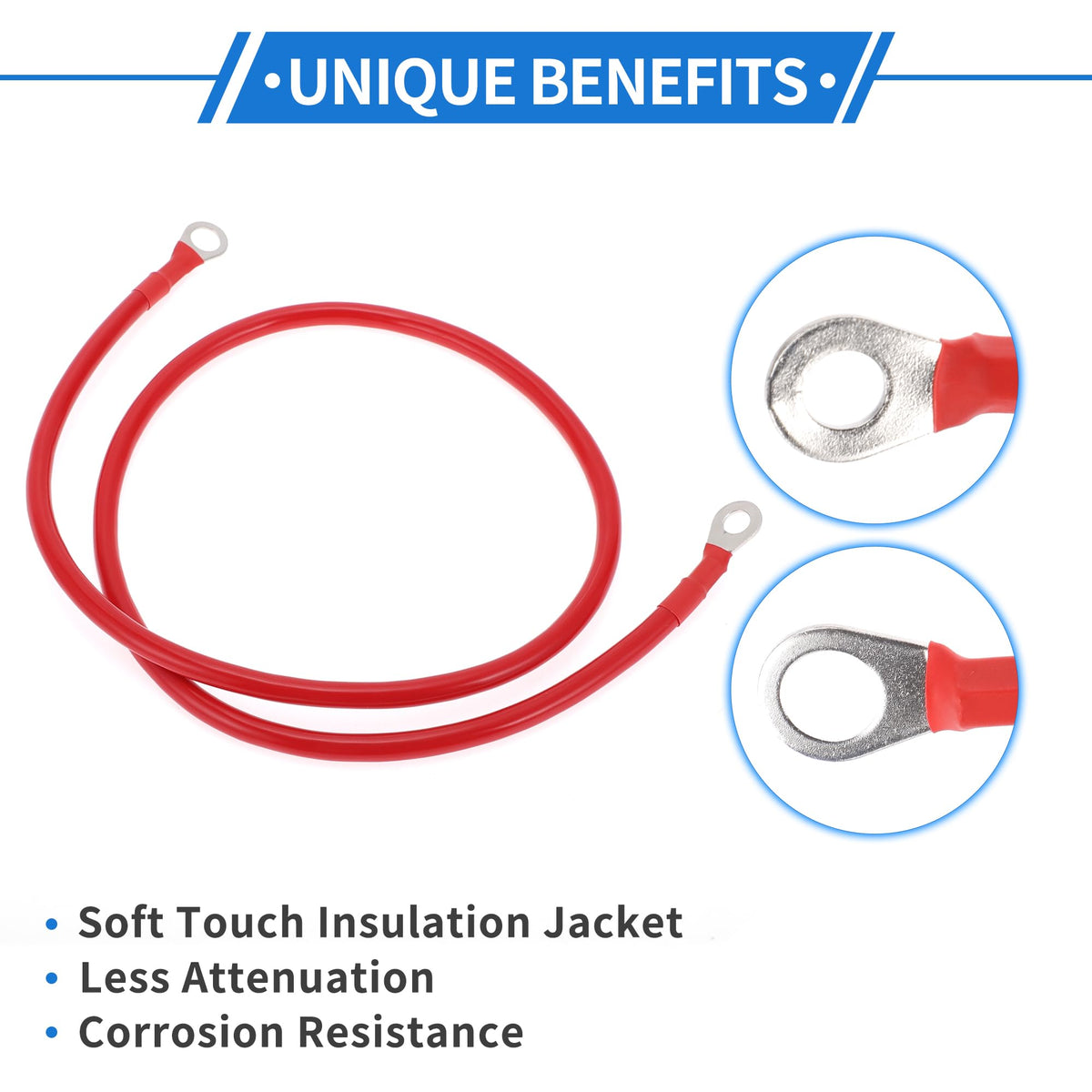 Product Information:Color: RedMaterial: Tinned CopperCable Length: 90cm / 3FTHole Diameter: 3/8'' Lug, 5/16'' LugCable Size: 6 AWG GaugeOperational Temperature Range: -40°C to +105°CVoltage Rating: 450v/750vVolume Resistivity: 0.554-1.35 ohm/kmProduct Highlights:The battery cable refers to the line that connects the battery to the car machine on the car, and is usually used as the power connection for low-power devices such as the car audio system, electric horn, and navigation system.The battery cable is directly connected to the car battery, and the voltage is relatively stable, which can provide a more stable power supply for the device.The red cable represents the positive, and the black cable represents the negative.Nickel-plated copper lugs for corrosion and oxidation resistance.Good PVC insulated for the cables.Cable ends are sealed with heat shrink tubing for heat insulation.Material:The battery cable is made of copper to provide maximum conductivity. They are wrapped in a PVC insulating sheath, wear-resistant and waterproof. They are also heat-resistant and flame-retardant to ensure safe use.Note:Removing: Remove the negative (black) cable before the positive (red) cable.Installing: install the positive (red) cable first before the negative (black) cable.Always wear safety glasses when working.Please make sure to measure the size before placing an order!How to use:Easy Installation. Universal fits for cars, vehicles, RV, solar applications, boats, and more, also used for electrical equipment.Content:1 Pc Battery Inverter Cable