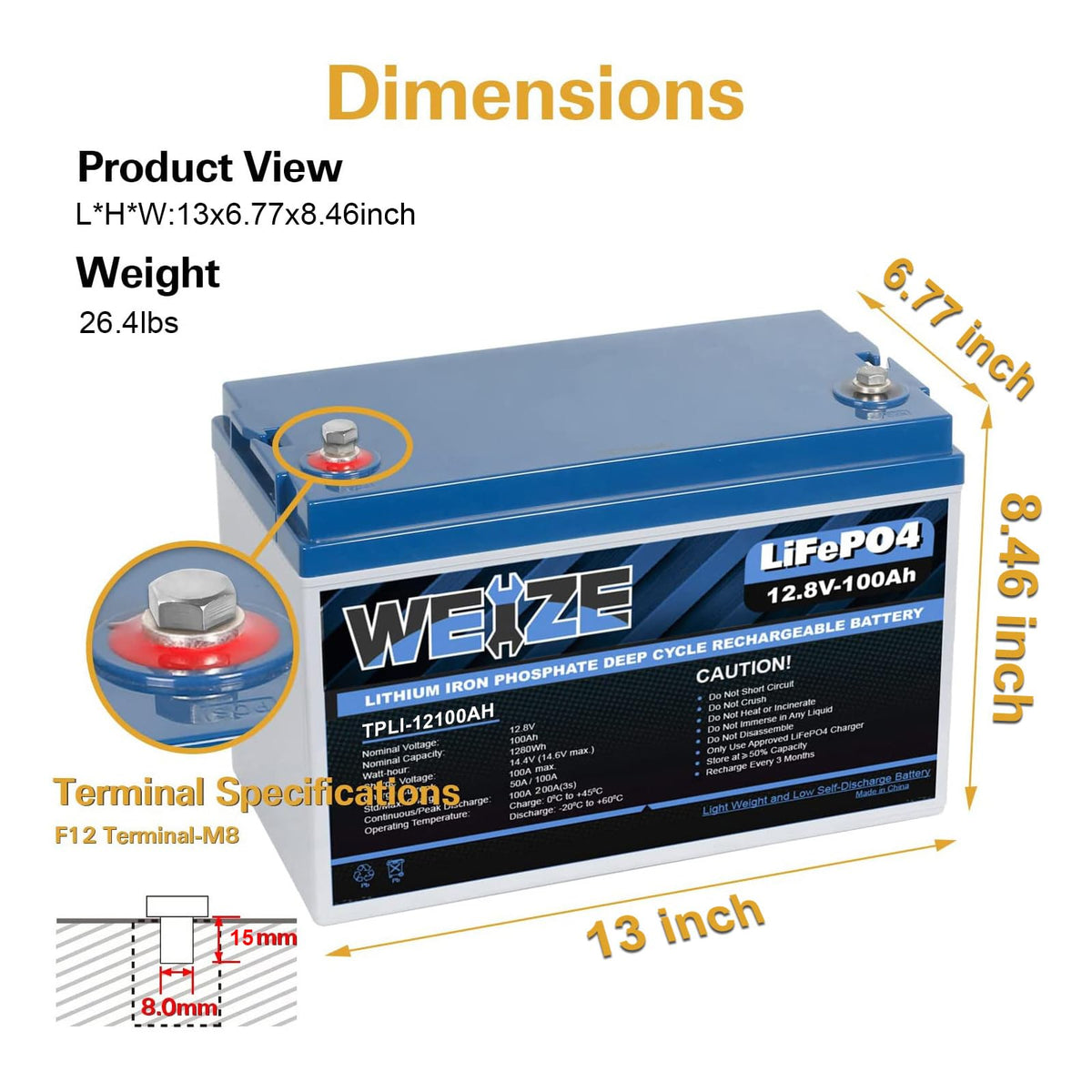 Item Dimensions: LxWxH=13 x 6.77 x 8.48 inches. | OUR SERVICE: As the No.1 lead acid battery brand on Amazon, Weize newest Lithium Iron Phosphate Batteries are confidently guaranteed for 10 years! We aim for quality followed up with quality customer service, Amazon doesn't deal with the return of battery-related products, so please contact the seller directly. Weize support team is on standby for YOU. | BUILT TO LAST: Our 12V 100Ah LiFePO4 Batteries live more than 2000 cycles at 100%/8000 cycles at 50%(Suggested) depth of discharge, without decreasing in performance. The average lifetime of lead-acid batteries is about two years(500 cycles) at just 50% discharge. This basically means a LiFePO4 battery will last you at least 5 times longer than a lead-acid battery, which actually reduces overall cost. It has cold weather protection which is critical. | AUTOMATIC BMS AND LOW TEMPERATURE CUT-OFF : The built-in Battery Management System (BMS) protects your battery from Over Charge and Discharge, Over Current, Short Circuiting, as well as Low and High Temperature for increased performance and longer life. The BMS will automatically cut off the battery and the voltage will drop below 1V. Only when the circuit is cut off, the battery will automatically reactivate after 1 second(No longer need a higher voltage input to activate). Besides, charging low temperature cut-off function will cut off the battery when the temperature below 32