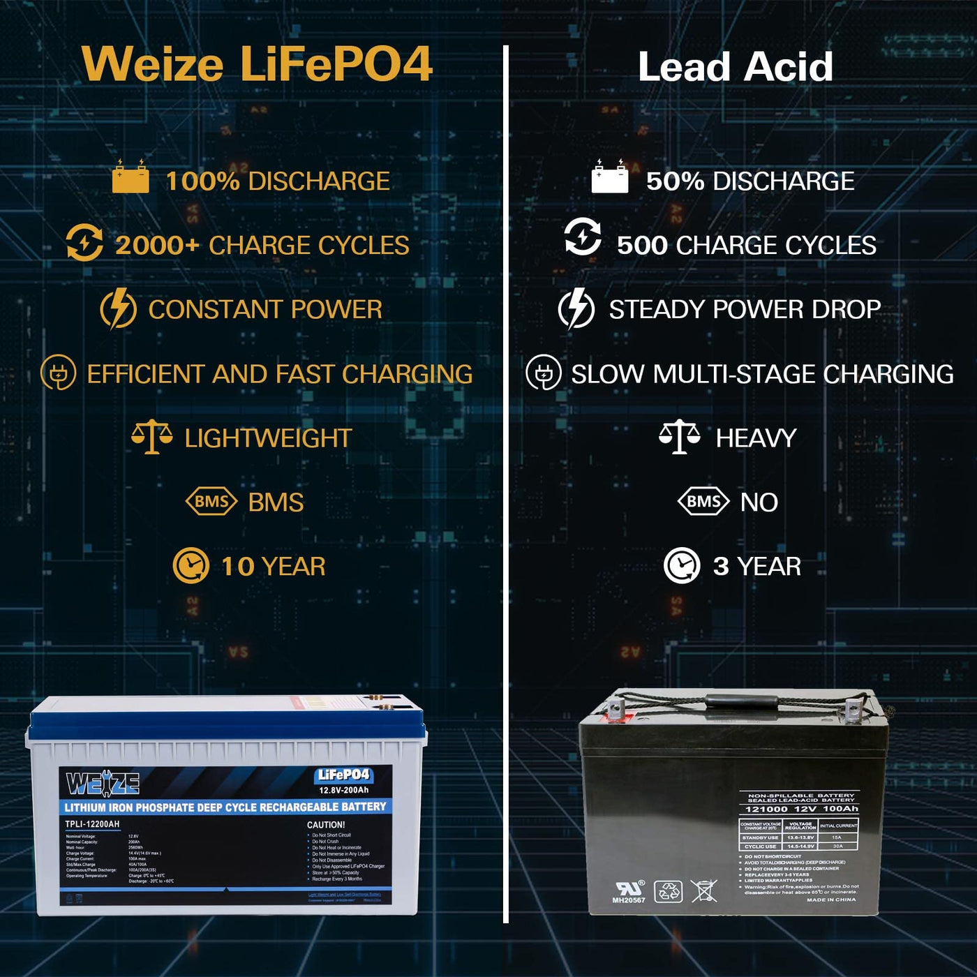 BUILT TO LAST: Our 12V 200Ah LiFePO4 Batteries live more than 2000 cycles at 100%/8000 cycles at 50%(Suggested) depth of discharge, without decreasing in performance. The average lifetime of lead-acid batteries is about two years(500 cycles) at just 50% discharge. This basically means a LiFePO4 battery will last you at least 5 times longer than a lead-acid battery, which actually reduces overall cost. | AUTOMATIC BMS AND LOW TEMPERATURE CUT-OFF : The built-in Battery Management System (BMS) protects your battery from Over Charge and Discharge, Over Current, Short Circuiting, as well as Low and High Temperature for increased performance and longer life. The BMS will automatically cut off the battery and the voltage will drop below 1V. Only when the circuit is cut off, the battery will automatically reactivate after 1 second(No longer need a higher voltage input to activate). Besides, charging low temperature cut-off function will cut off the battery when the temperature below 32