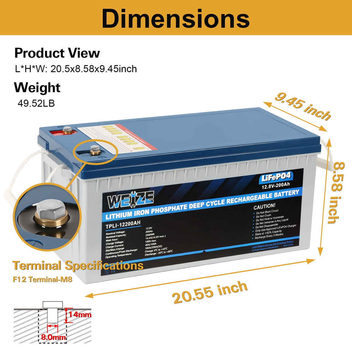 Weize 12V 200Ah Lifepo4 Lithium Battery, Built-In Smart Bms, 8000+ Deep Cycles, Low Temperature Protection Rechargable Battery P