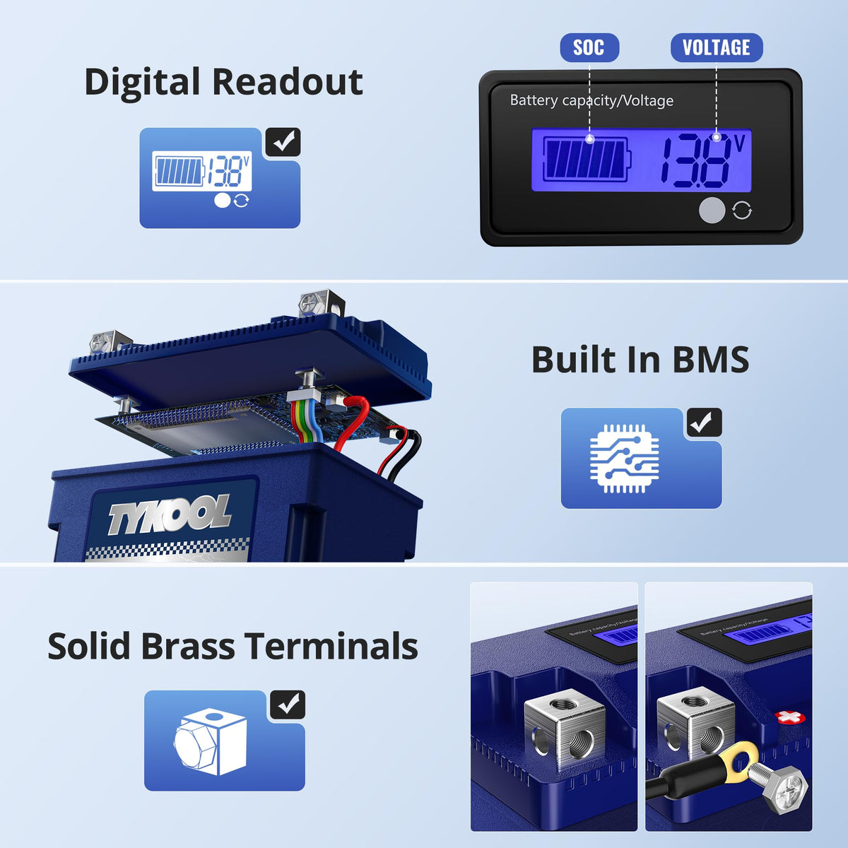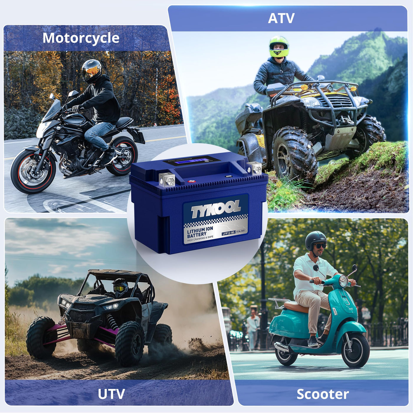 TYKOOL Lithium Powersports Battery,Powerful & Maintenance-Free! Main Parameters: Size: 5.91*3.42*5.12 in(L*W*H); Polarity:[+ -]; Weight:2.43 Pounds; Voltage: 12.8 V; Capacity: 6 Ah; CCA:360. Upgrade to instant power-no acid, no maintenance, and ready to ride. At just 2.43 lbs (5X longer life than lead-acid), it delivers 400A starting power (360A CCA) with 4000+ charge cycles. The smart BMS protects against extreme temps, overcharge, and shorts, while IP67 waterproofing and a digital SOC/voltage display keep you informed. Recharges 5X faster, so you spend less time waiting and more time riding. Backed by 24/7 U.S. support.