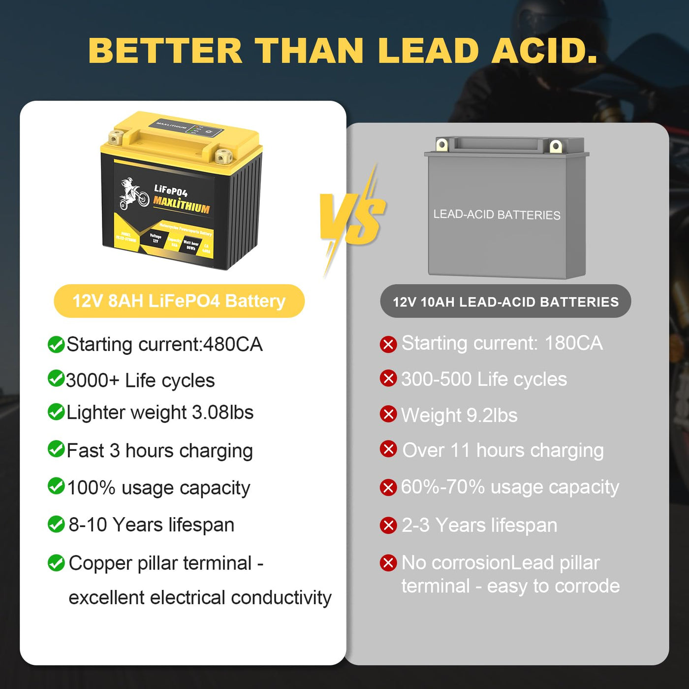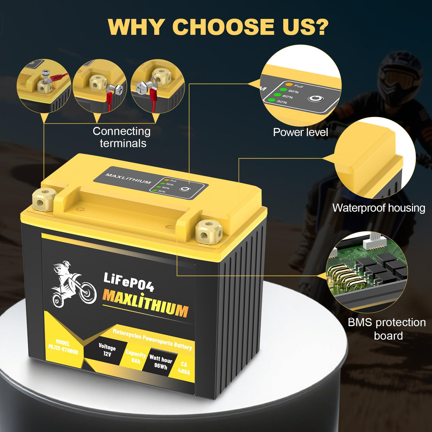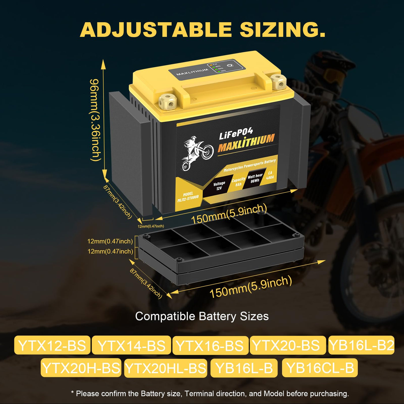 Introducing the Maxlithium Lithium Motorcycle Battery, the ultimate upgrade for your powersports vehicle. Designed as a perfect replacement for lead-acid batteries like YTX12-BS, YTX14-BS, YTX16-BS, YTX20L-BS, YTX20-BS, YTX20H-BS, and YTX20HL-BS, this lithium-ion battery offers unparalleled performance and reliability. With its high-rate cells, the Maxlithium battery delivers instant starting power, ensuring your motorcycle, ATV, UTV, snowmobile, or other compatible vehicle starts up smoothly and quickly. And thanks to its lightweight design, which is just one-third the weight of a traditional lead-acid battery, you'll experience easier handling and reduced strain on your vehicle's suspension.