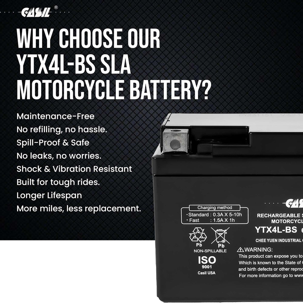 Features & Details YTX4L-BS AGM BATTERY Replacement Model: Casil YTX4L-BS 12V 3AH Condition: New Includes: battery and screws Warranty: 1 Year Pro-Rated Warranty Manufacturer: Chee Yuen Co., Ltd Product Description This YTX4L-BS is a sealed lead-acid (SLA) absorbed glass mat (AGM) rechargeable battery. AGM and GEL batteries are lead-acid and of the same battery chemistry. This battery comes already charged, sealed, maintenance free, and ready to install.Premium quality absorbed glass mat technology (AGM) is ideal for ATVs, Motorcycles, Personal Watercraft, Jet Ski's, Snowmobiles and more. Specifications Vehicle Service Type: Motorcycle, snowmobiles, personal watercraft, all-terrain-vehicles, jet ski, scooter Size: YTX4L-BS Voltage: 12 Volts Chemistry: SLA, AGM Terminal: Nut & Bolt Item Weight: 2.65 lbs Item Dimensions: 4.41 x 2.8 x 3.35 inches