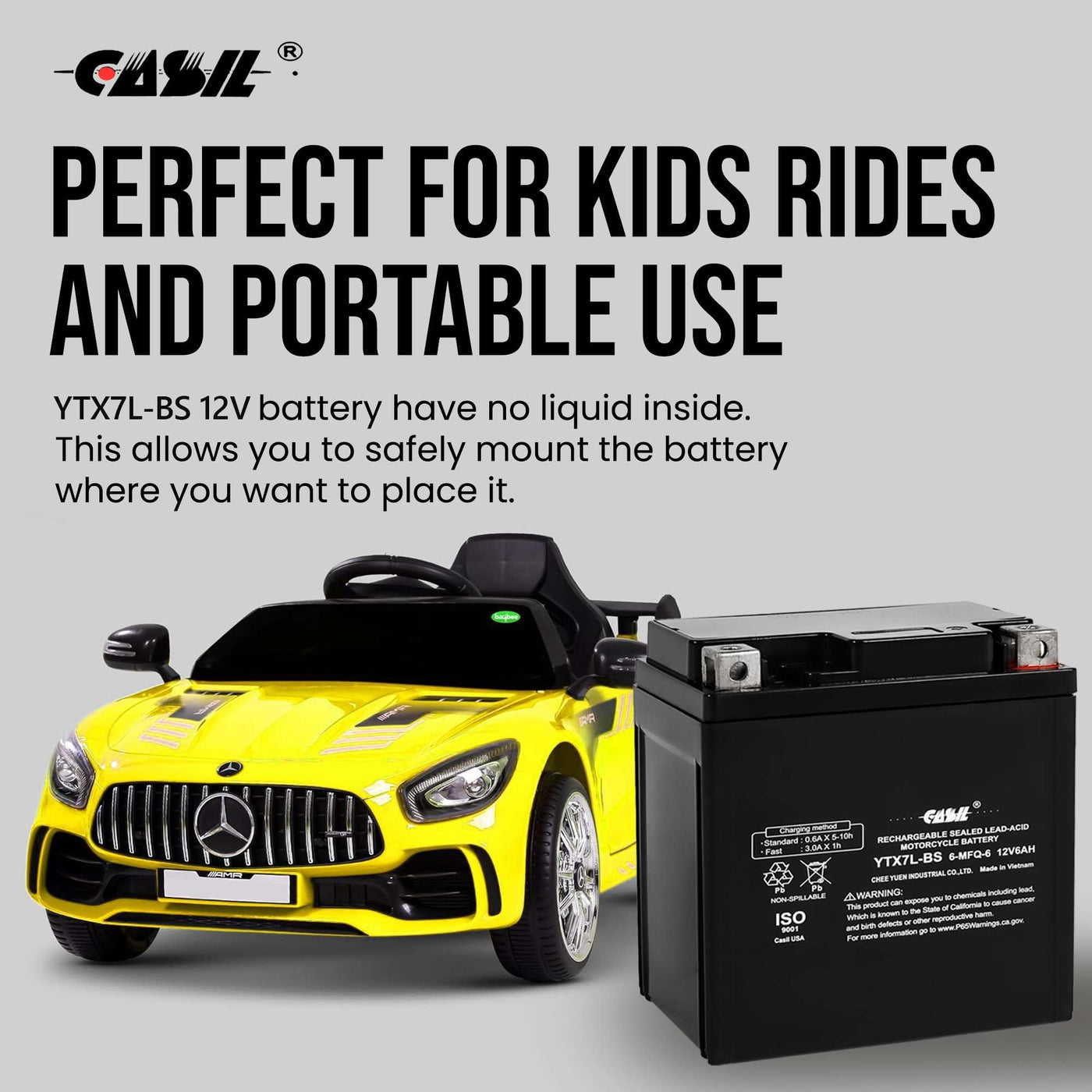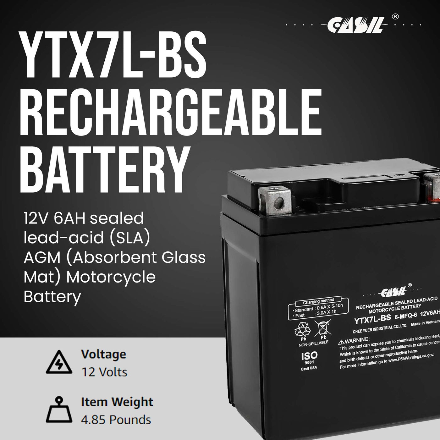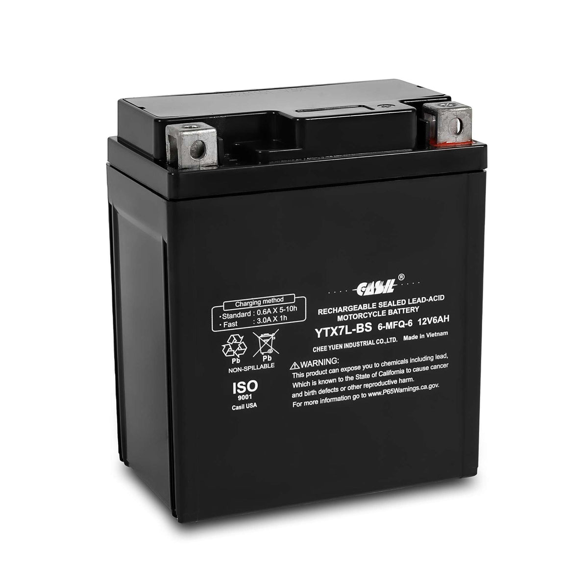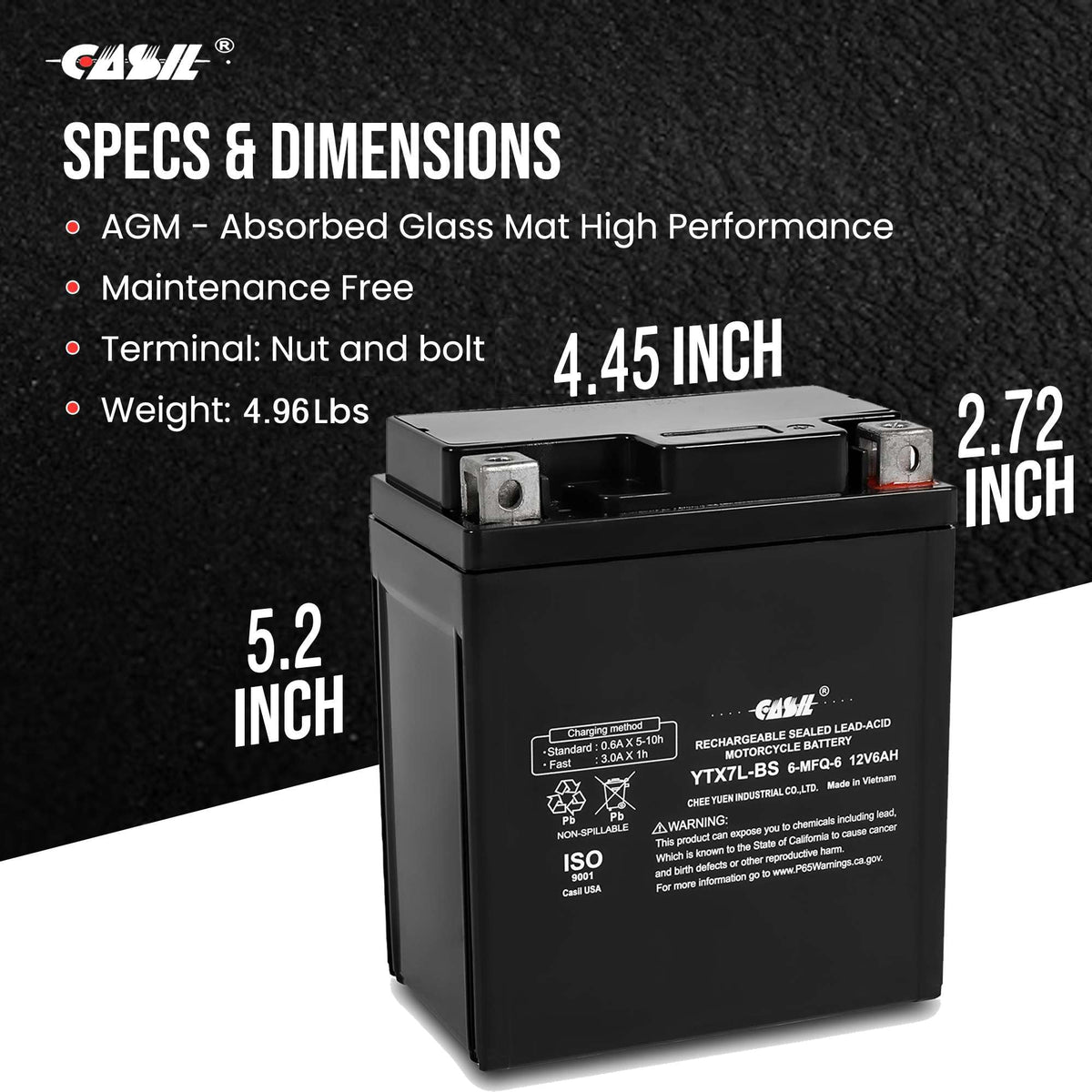Compatible With ATV: Kawasaki KFX450R; Motorcycle: Aprilia Mojito, RS4 125,ATK All Electric Start Models, Beta 4 Stroke,Bimota DB3 Mantra,SB6, SB7,Honda CB250 Nighthawk,CB300F,CB300RA,CB600F (599),CBR250R,CBR300R,CBR300R, RA,CMX250C Rebel,CMX300, A,CMX500, A,CRF230L,NX125,NX250,Kawasaki EX250 Ninja,KL250 Super Sherpa,KLX140, G, L,KLX250, S, SF, Camo,W175 SE,KTM Duke,Suzuki DR125, SE, SES,DR200S,DR200SE,DR250S EP, ER, ES,DR350SE,GZ250,RV 200, VanVan200,RV125 SE, R,TU250X,XT225 Serow,YZF-R3; Scooter: Aprilia Mojito,Honda NHX110 Elite,PCX150,SH125,SH150,Piaggio FLY 50,FLY150, Piaggio-Vespa KX150, Primavera, Sprint,Primavera, Sprint; Snowmobile: Arctic Cat ZR 200, Yamaha SXR2 Sno-Scoot; YTX7L BS Battery Specifications Dimensions: (L) 4.49 in x (W) 2.80 in x (H) 5.16in Weight: 5.28 Lbs CCA: 100 Voltage: 12V Capacity (10 hours rate): 6AH Charge Current (A): 0.6A Case Material: ABS Separator: AGM They differ from Conventional Motorcycle Batteries in that they do not need constant care and addition of water, which saves you a lot of time and effort. They also will not spill acid and have a slower discharge rate than the conventional batteries.
