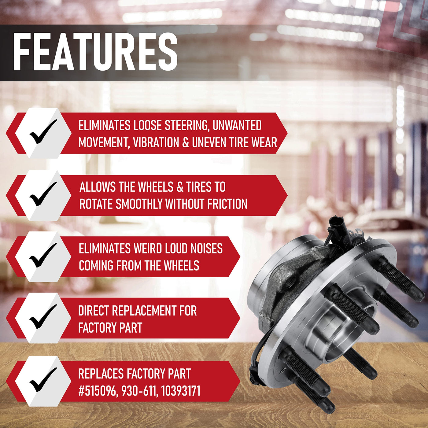 The front wheel bearing and hub assembly is a crucial part of the drivetrain as it enables the wheels and tires to rotate smoothly without friction. Wheel hub bearing problems can easily be identified by loud noises from the wheel area, loose steering or unwanted movement, vibration and uneven tire wear. Installation is easy with no special tools required and it will fit, look, and work like the factory wheel hub bearing. Fits the following 4WD vehicles WITH 6 LUGS: 2007-2014 Escalade 2007-2014 Escalade ESV 2007-2013 Escalade EXT 2007-2013 Avalanche 2007-2013 Silverado 1500 2007-2014 Suburban 1500 2007-2014 Tahoe 2007-2013 Sierra 1500 2007-2014 Yukon 2007-2014 Yukon XL 1500 Replaces part numbers: 515096, 930-611, 10393171, 22841381, 930611, 25918329, 25976819 This is a compatible replacement part manufactured by AA Ignition. This wheel bearing hub is NOT a genuine OEM part. Vehicle makes and their associated vehicle models and part numbers are used in this listing only to identify the vehicles this wheel bearing hub assembly fits.