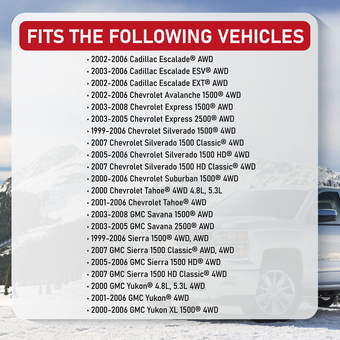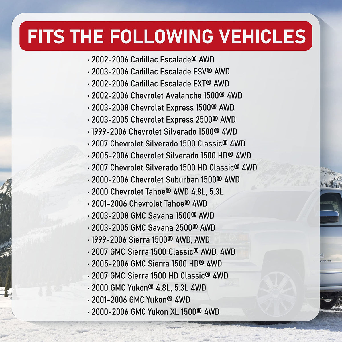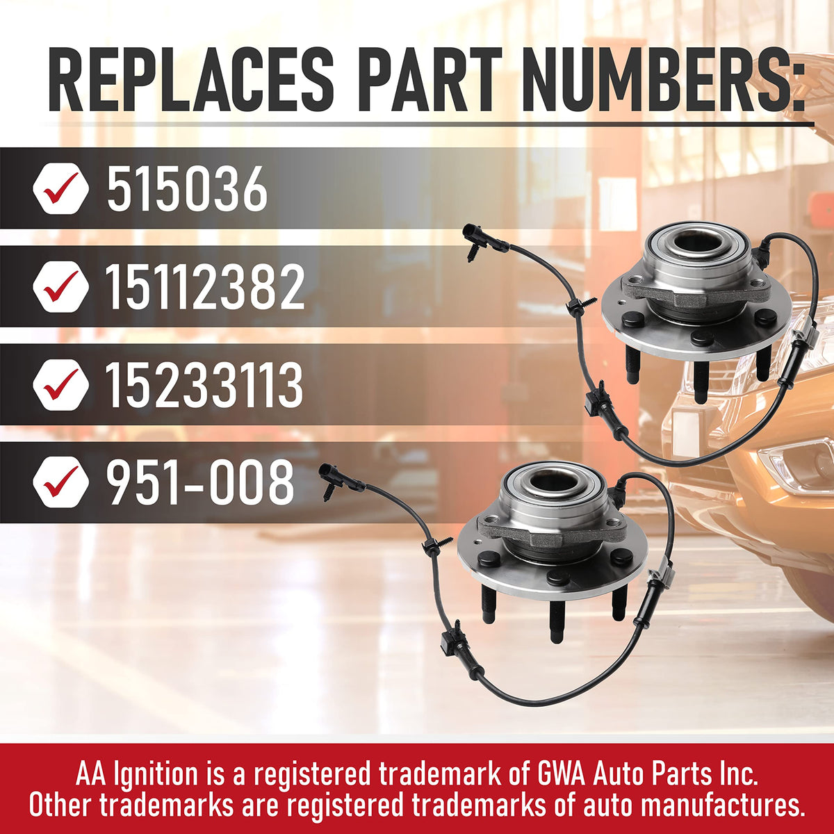 This wheel bearing and hub assembly is a crucial part of the drivetrain as it enables the wheels and tires to rotate smoothly without friction. Wheel hub bearing problems can easily be identified by loud noises from the wheel area, loose steering or unwanted movement, vibration and uneven tire wear. The wheel hub bearing can easily be accessed by removing the wheels of the vehicles and it fits either left or right of the front wheels. Compatible with the following vehicles with 6-lug: 2002-2006 Escalade AWD 2003-2006 Escalade ESV AWD 2002-2006 Escalade EXT AWD 2002-2006 Avalanche 1500 4WD 2003-2008 Express 1500 AWD 2003-2005 Express 2500 AWD 1999-2006 Silverado 1500 4WD 2007 Silverado 1500 Classic 4WD 2005-2006 Silverado 1500 HD 4WD 2007 Silverado 1500 HD Classic 4WD 2000-2006 Suburban 1500 4WD 2000 Tahoe 4WD 4.8L, 5.3L 2001-2006 Tahoe 4WD 2003-2008 Savana 1500 AWD 2003-2005 Savana 2500 AWD 1999-2006 Sierra 1500 4WD, AWD 2007 Sierra 1500 Classic AWD, 4WD 2005-2006 Sierra 1500 HD 4WD 2007 Sierra 1500 HD Classic 4WD 2000 Yukon 4.8L, 5.3L 4WD 2001-2006 Yukon 4WD 2000-2006 Yukon XL 1500 4WD Replacement part number: 515036, 15112382, 15233113, 951-008 This is a compatible replacement part manufactured by AA Ignition. This wheel hub bearing assembly is NOT a genuine OEM part. Vehicle makes and their associated vehicle models and part numbers are used in this listing only to identify the vehicles this wheel hub bearings fits.