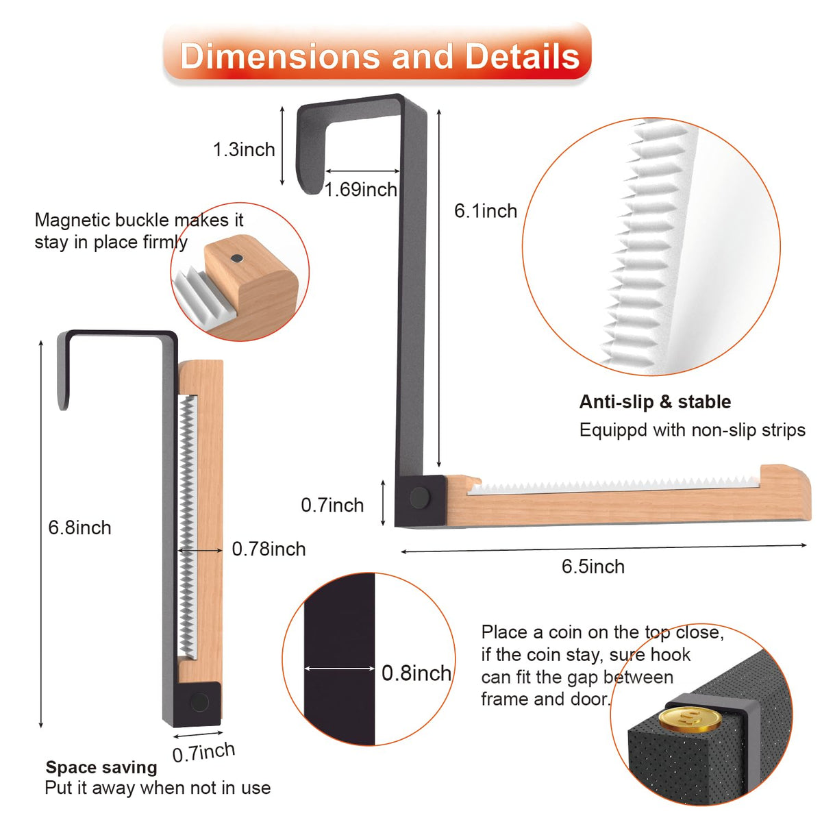 Q: What materials are used in the Over Door Hook Hanger?A: The Over Door Hook Hanger is made from high-quality carbon steel combined with thick solid wood, ensuring both durability and lightweight functionality for everyday use.