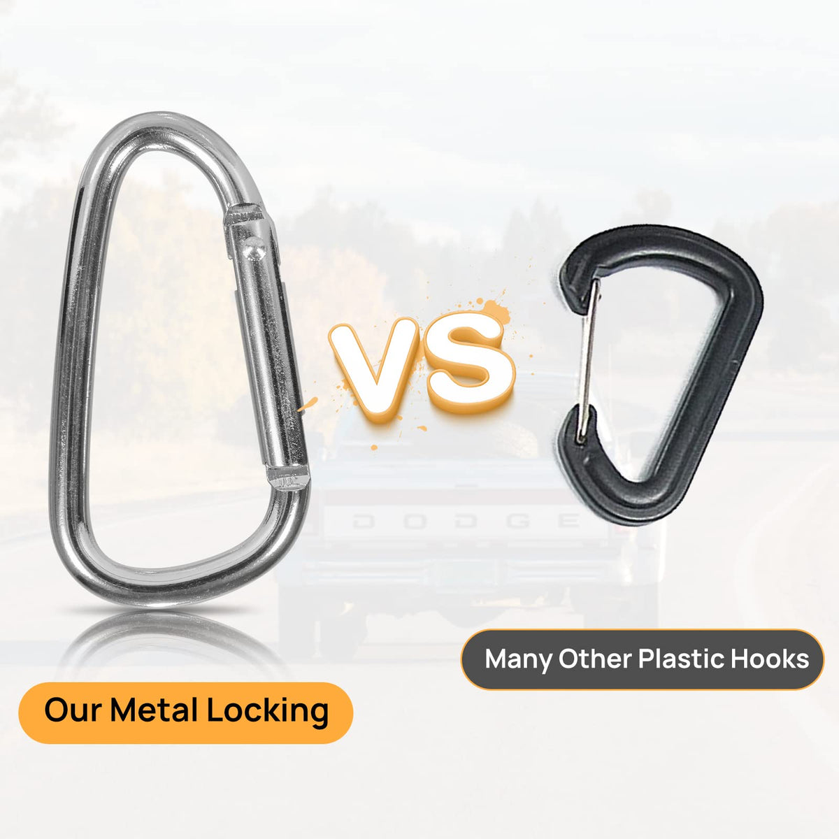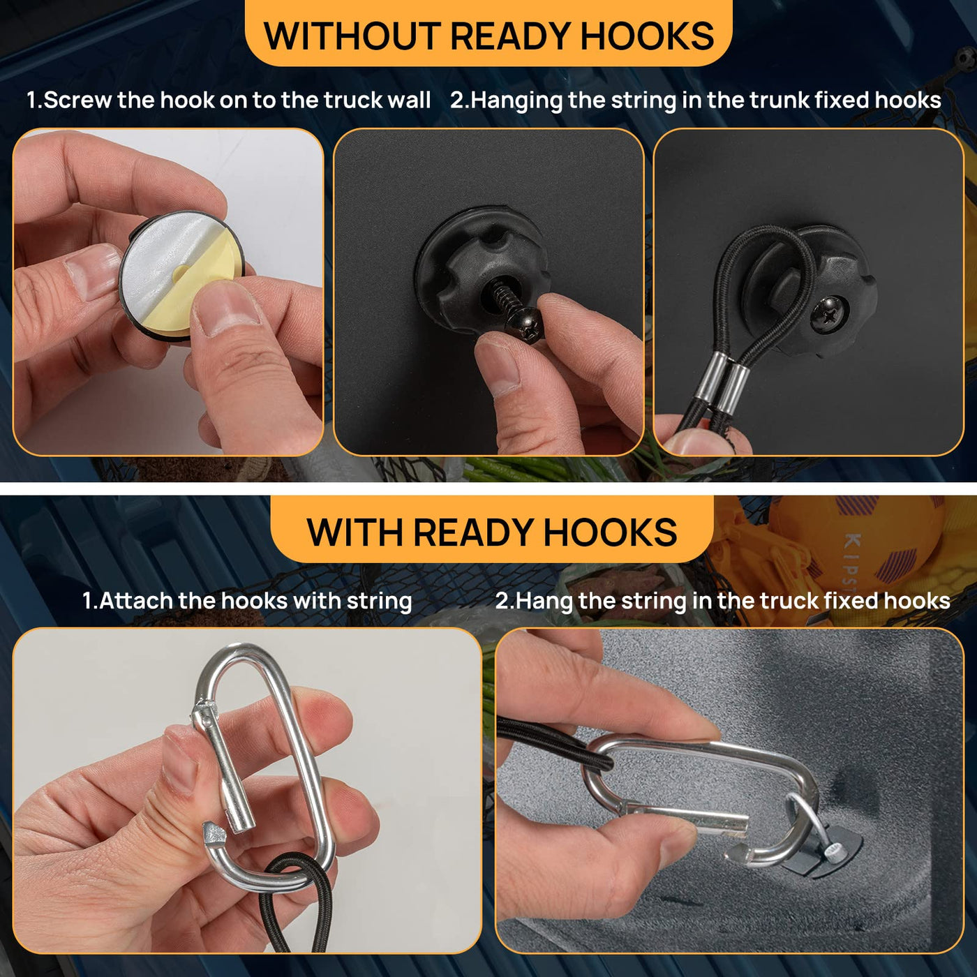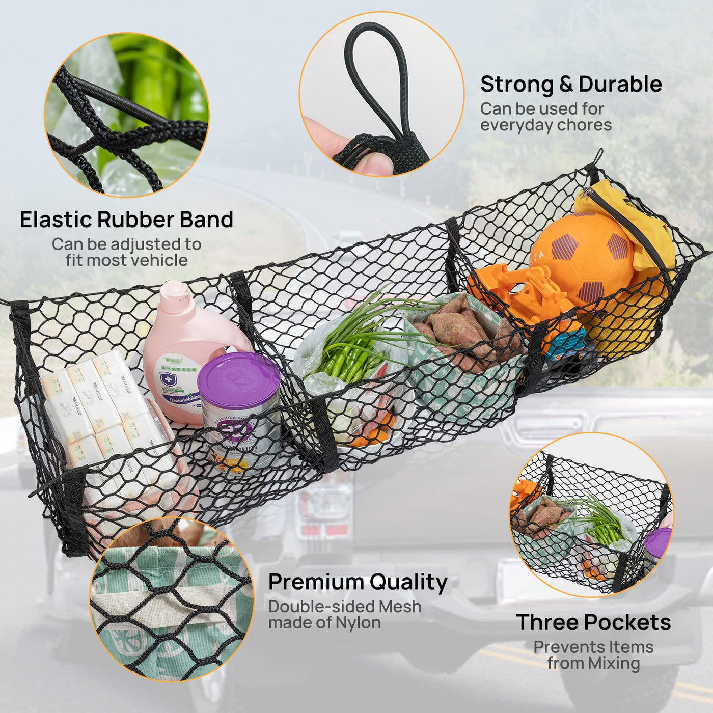 Are you tired of groceries rolling around your truck bed? Frustrated with tools and gear getting damaged during transport? The Kaskawise 3-Pocket Truck Bed Cargo Net Organizer is the solution you've been looking for!Our heavy-duty truck bed organizer features THREE SEPARATE POCKETS that keep your cargo neatly organized and prevent items from sliding around. Each pocket measures 14.2''/36cm wide, providing ample space for groceries, tools, emergency kits, camping gear, and sports equipment. Everything stays securely in place, even on bumpy roads or during sudden stops.SUPERIOR CONSTRUCTION: Made from high-density mesh fabric that's tear-resistant, weather-resistant, and built to withstand daily use.METAL HOOKS, NOT PLASTIC: Four heavy-duty metal hooks provide secure attachment to your truck bed tie-downs or rails.REINFORCED STITCHING: Double-stitched seams ensure durability even with heavy loads up to 50 pounds.PERFECT SIZE: The 43.3 11.8 inch size fits standard truck beds perfectly, while our larger 51.1 15.7 inch option accommodates full-size trucks.STRETCHY YET STRONG: Elastic material accommodates oddly shaped cargo while maintaining tension to prevent movementUniversal Fit for All Pickup Trucks.Our cargo net organizer is designed to fit virtually all pickup trucks on the market:TOYOTA: Tacoma, Tundra, Hilux,FORD: F-150, F-250, Ranger, Maverick,CHEVROLET/GMC: Silverado, Colorado, Sierra,DODGE/RAM: 1500, 2500, 3500,NISSAN: Frontier, Titan