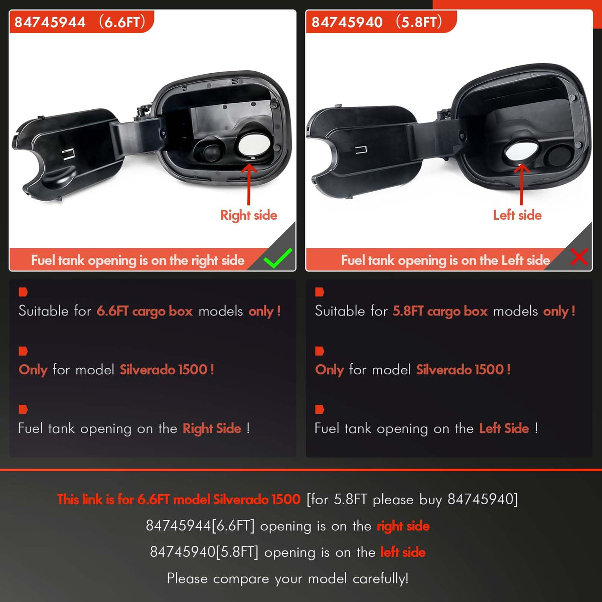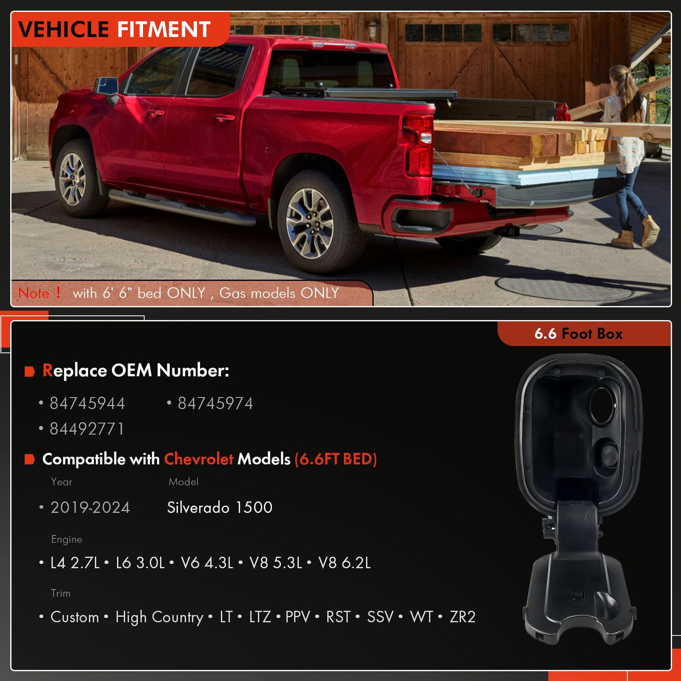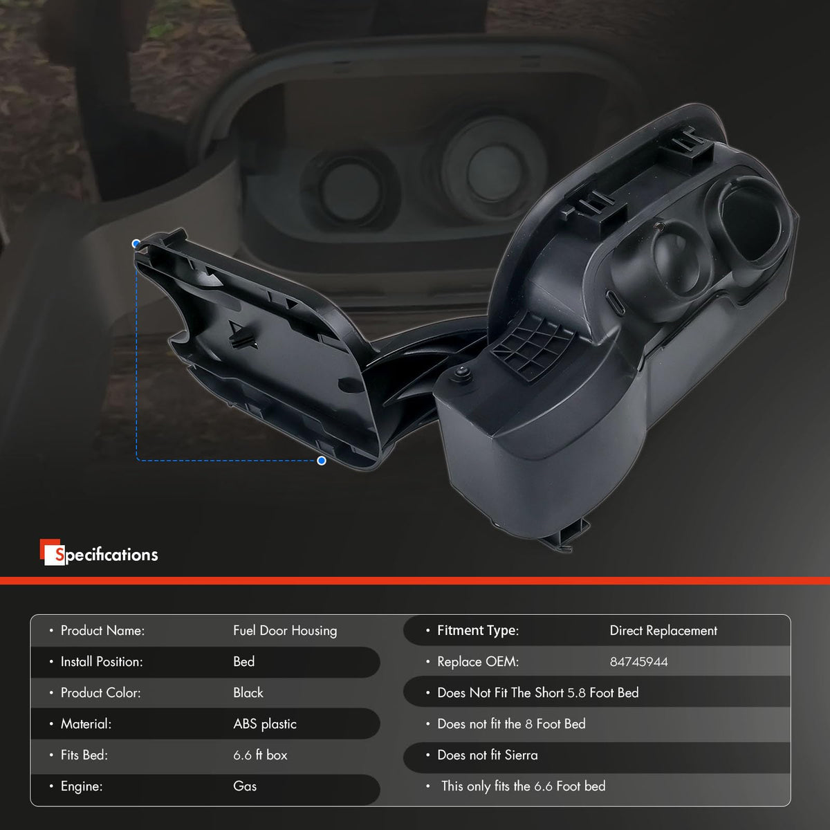 Fuel Door Housing Assembly | Fit for Chevrolet Silverado 1500 2019-2024 | OEM Standard | ABS Plastic & Reinforced Spring Structure[Precise Vehicle Fitment]Designed to meet exact specifications, this Fuel Door Housing Assembly is compatible with Chevrolet Silverado 1500 (2019-2024) models equipped with L4 2.7L, L6 3.0L, V6 4.3L, V8 5.3L, and V8 6.2L gasoline engines, exclusively for 6'6'' bed configurations. This ensures a precise fit and seamless integration with your vehicle, matching the factory design for hassle-free replacement. (Part Number: 84745944)[Premium ABS Plastic & Reinforced Spring Structure]Crafted from high-quality ABS plastic with an upgraded metal spring structure, this fuel door housing is built for superior durability. Its impact-resistant material withstands moisture, temperature fluctuations, and daily wear, ensuring reliable performance in all weather conditions. Whether facing rain, snow, or extreme heat, this housing remains strong and functional over time.[OEM Standard Compliance]Engineered to OEM specifications, this fuel door housing matches the original part in terms of performance, durability, and aesthetics. It guarantees a secure fit, smooth operation, and long-term reliability, making it a perfect direct replacement for your factory fuel door housing.[Enhanced Functionality & Durability]This fuel door housing assembly ensures smooth and secure fuel cap operation, preventing leakage while maintaining the integrity of the fuel system. Its reinforced impact-resistant design protects against bumps, vibrations, and external damage, making it ideal for off-road driving and tough conditions.[Quick & Easy Installation]Designed for hassle-free installation, this fuel door housing does not require any complex tools or professional expertise. The straightforward design allows for quick replacement, saving both time and money while avoiding costly mechanic fees. Even with minimal experience, you can install it efficiently and restore your trucks fuel door function in no time.Why Choose This Fuel Door Housing?? Exact fit for Chevrolet Silverado 1500 (2019-2024) gas models with 6'6'' bed? Durable ABS plastic & metal spring structure for long-lasting performance? OEM-standard replacement for factory-quality fit & function? Weather-resistant & impact-resistant design for enhanced reliability? Effortless installation without the need for special toolsUpgrade your Silverados fuel door housing with this high-quality replacement, ensuring smooth functionality, durability, and long-term performance in any driving conditions.