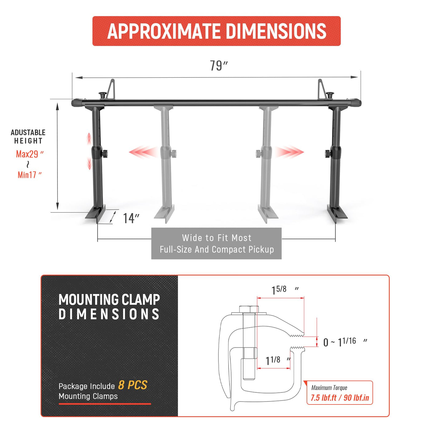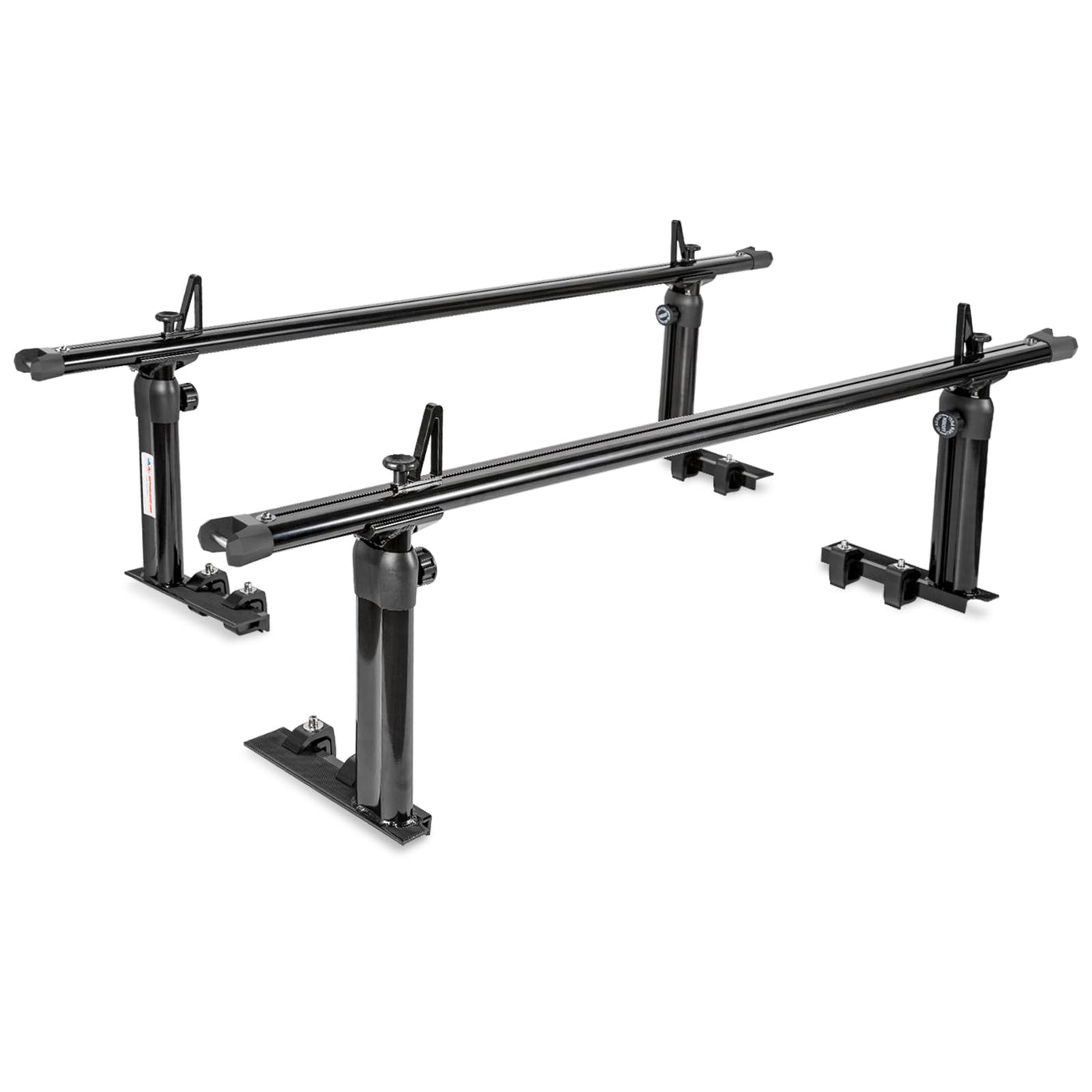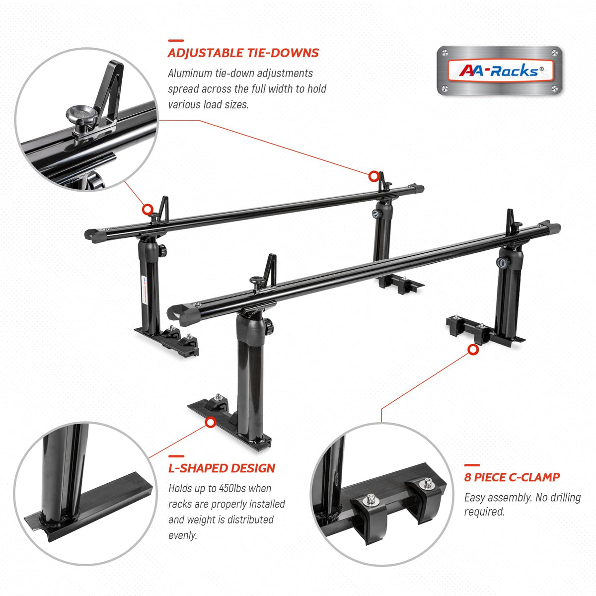 The APX2501 is a Height-Adjustable aluminum pick-up truck rack built for ladder, lumber, kayak utilities carrying. Custom Adjust Bar Height provides maximum carrying versatility for easy loading, carrying and storage.This rack set has been stationary weight-tested with 450 lb loads. It features the rust-free material of aluminum.The Nylon endcaps and stainless steel hook, quick installation and use, make it easy to secure gear. It also comes with eight aluminum C-clamps for non-drilling installation,making it compatible with a variety different truck models. This unit is Powder-coated with weather resistant paint. Built to work & last.
