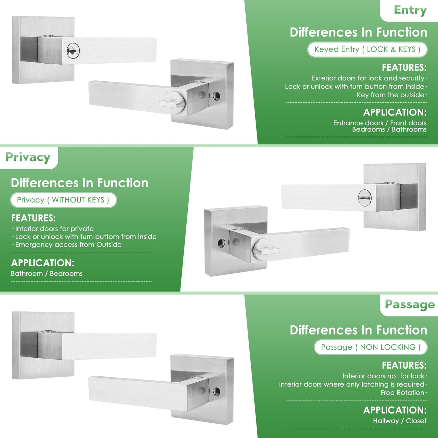 Keyed entry function is perfect for use on entry doors where keyed security is needed; unlocks from the inside when the door handle is rotated, allowing you to leave quickly and re-enter easily from the outside; includes lockset and 2 keys.
