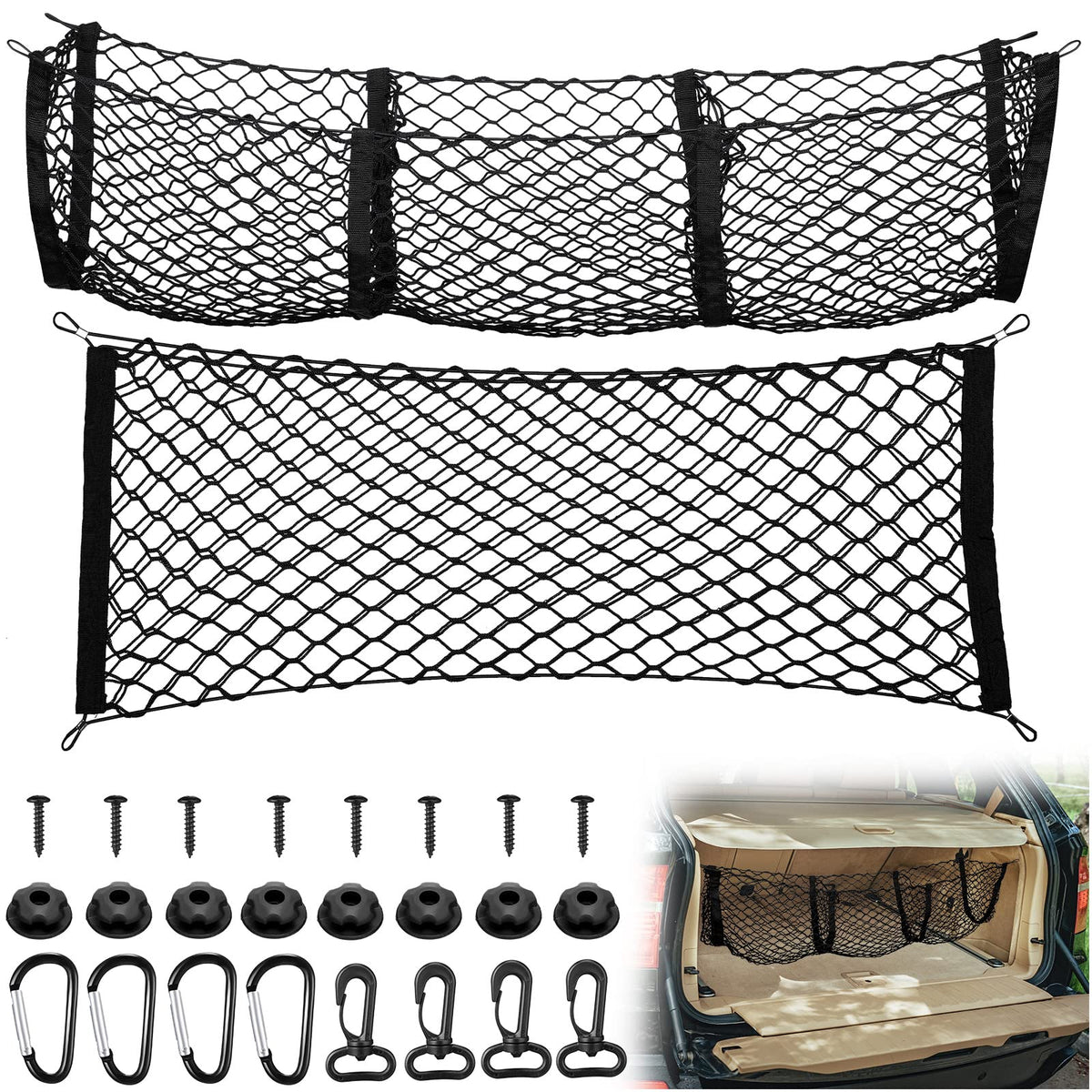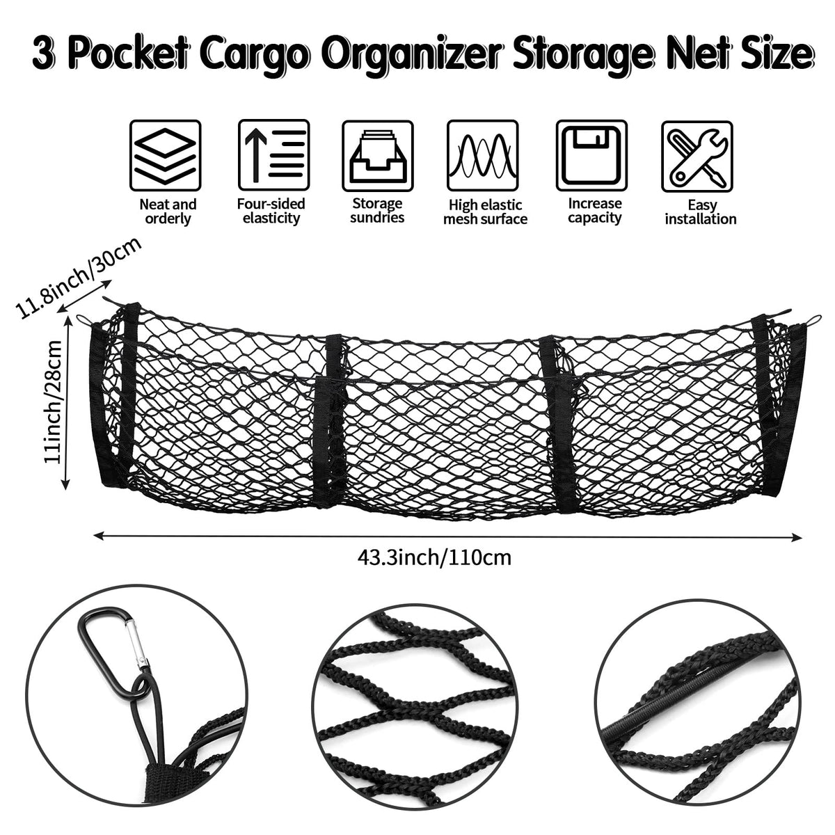 Q: What are the dimensions of the automotive cargo net?A: The elastic trunk storage net measures approximately 35.4 x 15.7 inches, while the cargo net with 3 pockets measures around 43.3 x 11.8 inches.