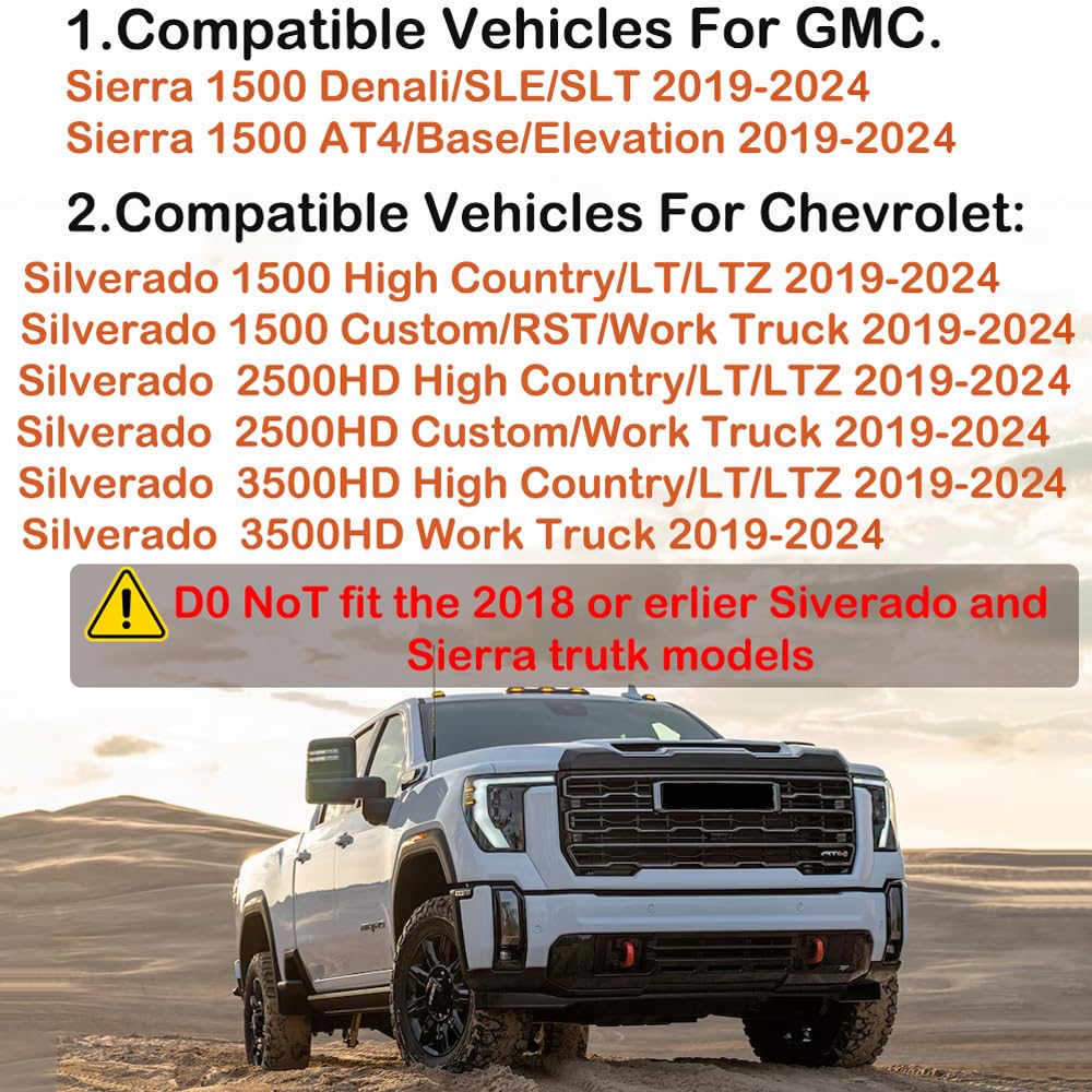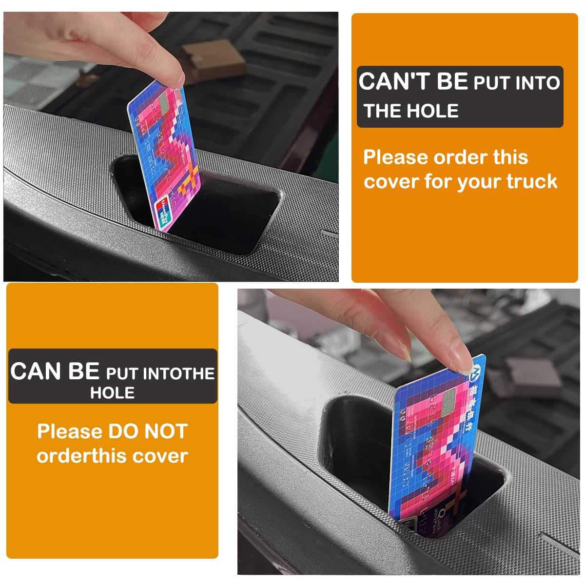 Compatibility of these truck models: 1.2019-2024 Chevy Silverado 1500 2.2020-2024 Chevy Silverado 2500HD/3500HD 3.2019-2024 GMC Sierra 1500 4.2020-2024 GMC Sierra 2500HD/3500HD For a quick check, observe the credit card slot orientation. If you can't insert the credit card vertically (as shown in the picture), it's a fit. Otherwise, if the card does fit vertically, it's not compatible. Keep in mind that this product does not fit the 2018 or earlier Silverado and Sierra truck models.