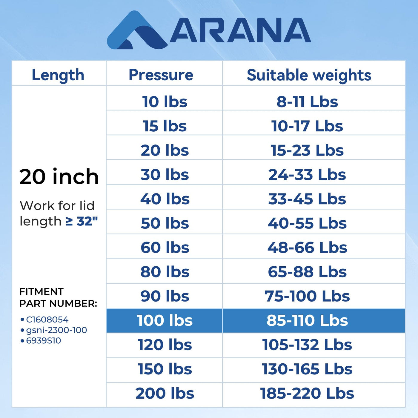 Qty (2) 20 Inch Lift Supports Struts -- Force 100 Lb Each Shock, If Your Project Is Less Than 50 Lbs, You Can Just Install One Strut, If About 80-110Lbs, You Could Install Both Struts; If You Project Lid Is More Than 120 Lbs, We Recommend You Install Other Stronger-Pressure Struts, We Have 20Inch Gas Struts Of Different Force: 40Lb/60Lb/80Lb/120Lb/150Lb; Measurement First For The Weight Of Your Project Lid Is Required Before Purchasing! If Uncertain, Please Message Us, We Will Help You Confirm And Recommend The Suitable Set!