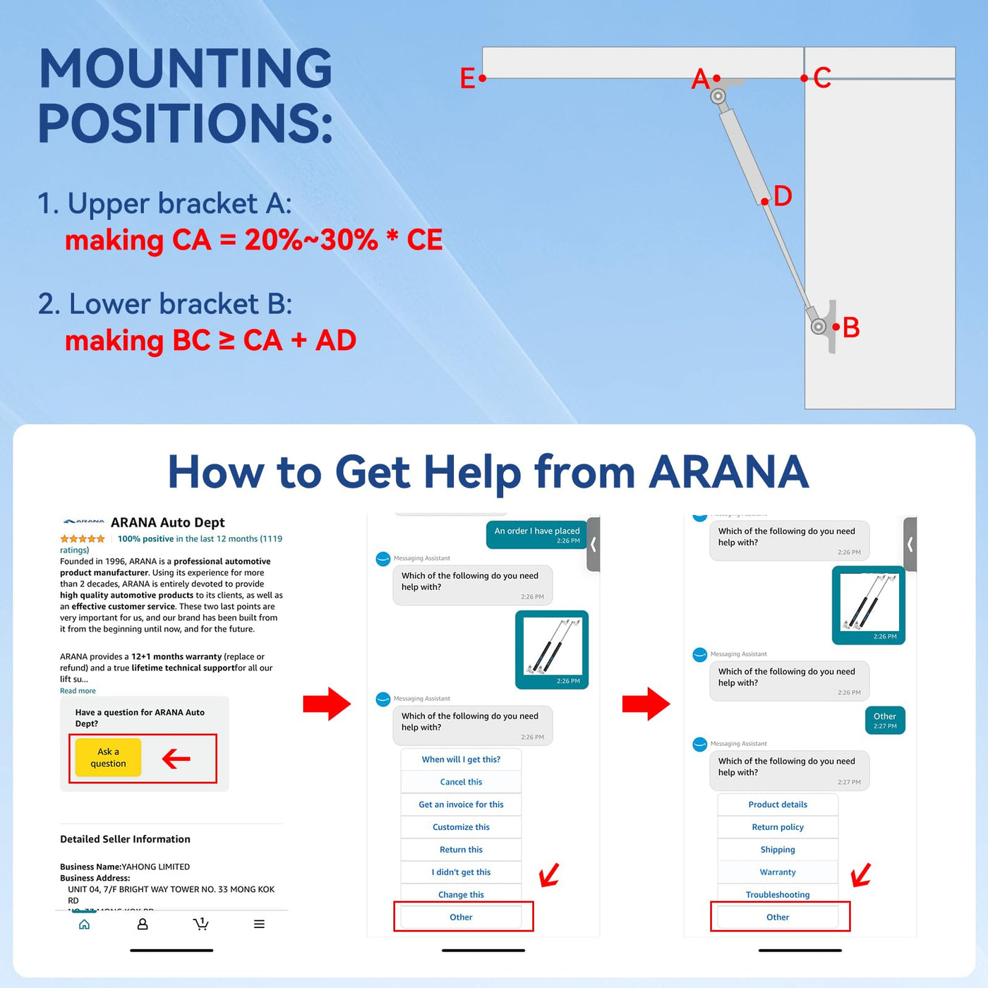 Q: What are the dimensions of the C1608054 struts?A: The compressed length of the C1608054 struts is 11.8 inches (300mm), and the extended length is 19.7 inches (500mm). This allows for a suitable fit in various applications such as camper shells, RV beds, and storage boxes.