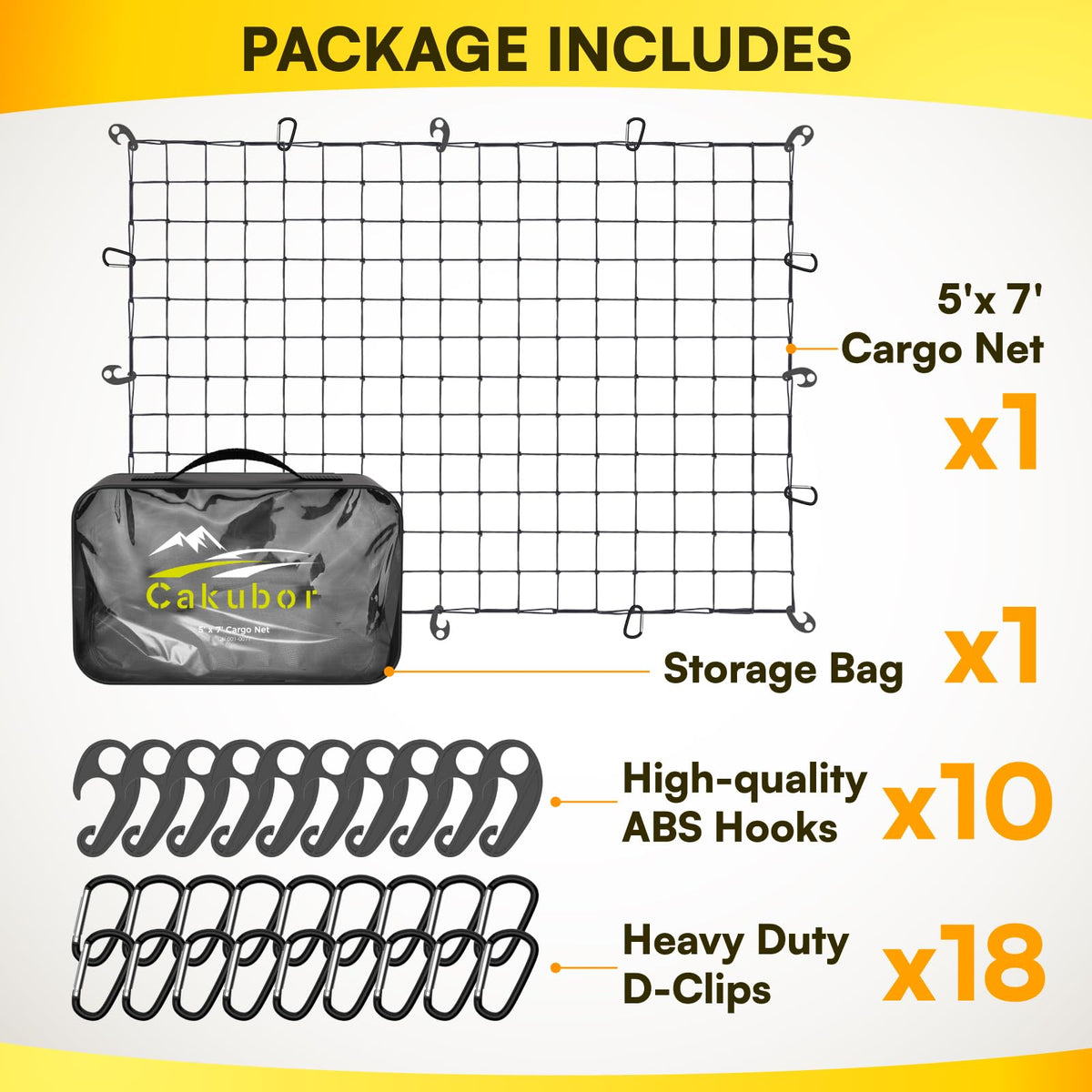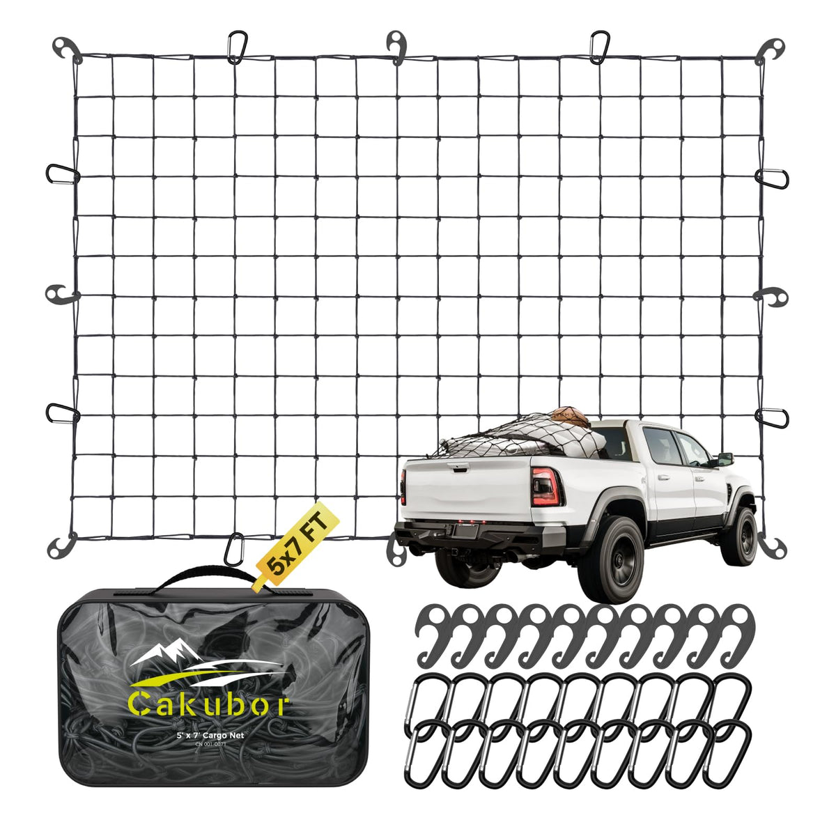 Cakubor 5'x7' Cargo Net for Pickup Truck Bed SUV, Stretches to 13'x18' Roof Rack Cargo Net, 4.9''x4.9'' Mesh Bungee Netting with 28 Pieces Universal Hooks for Large Loads