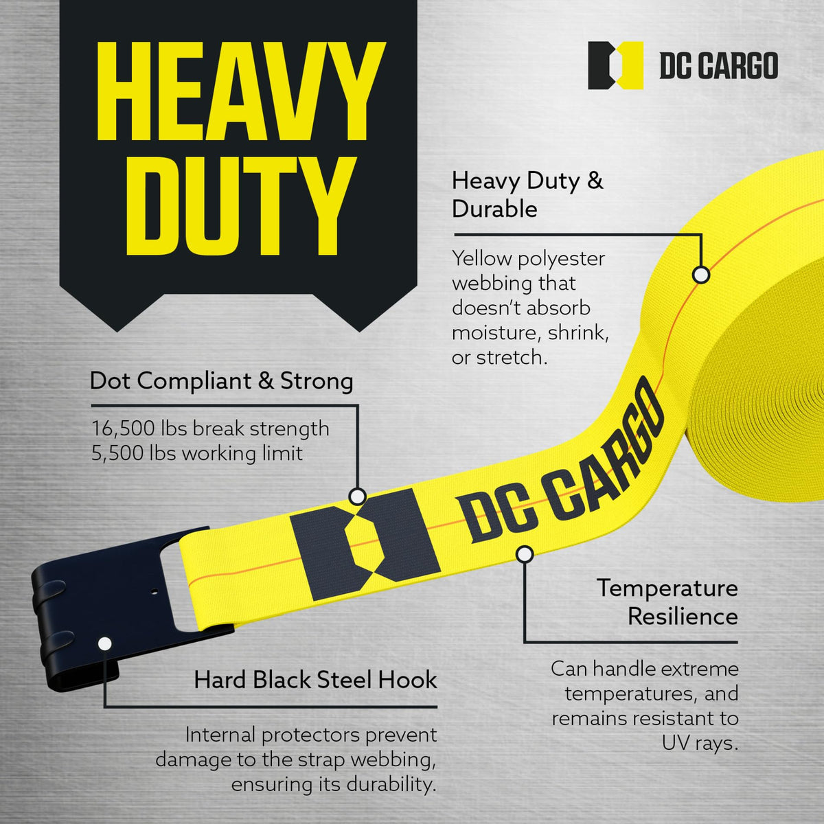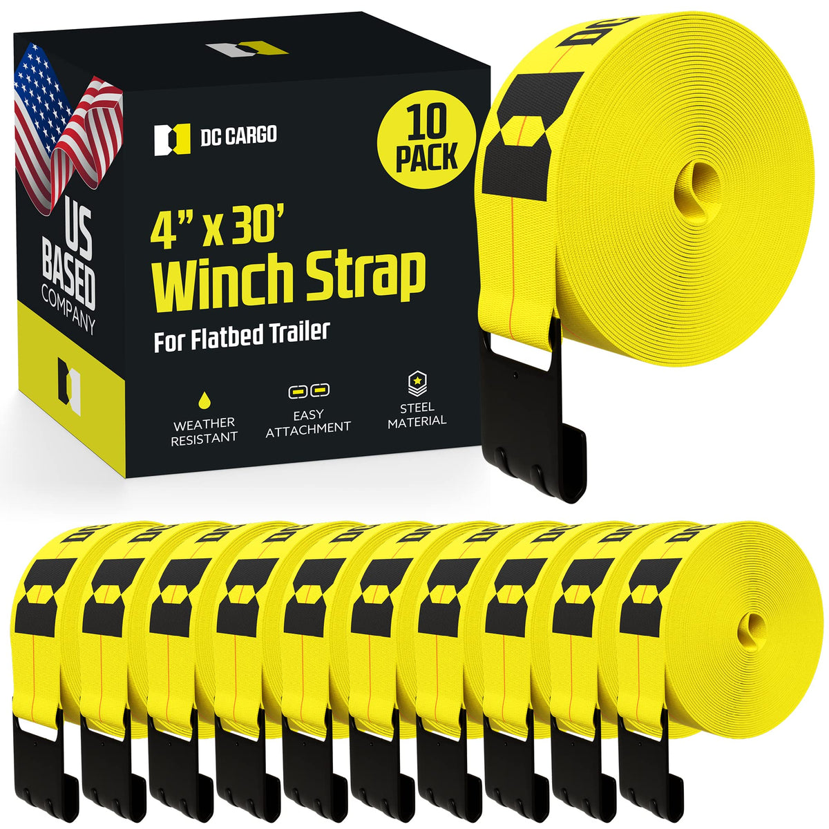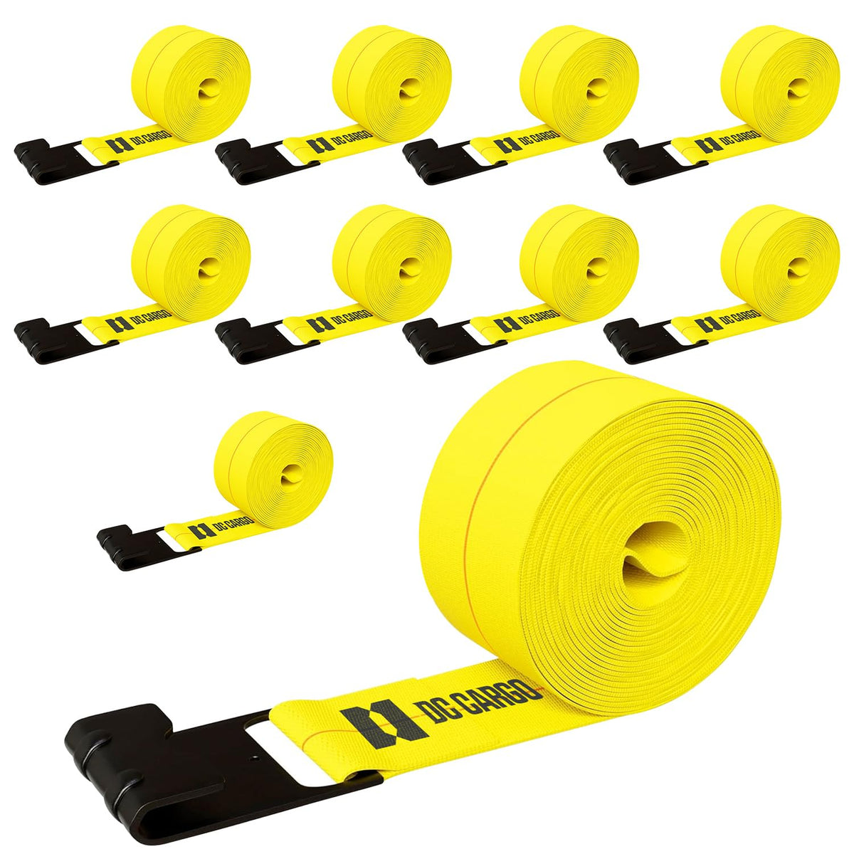 Pack of 10 Flatbed Trailer Load Cargo Tie-Down Winch StrapsYour cargo load needs reliable security when on the road and nothing says flatbed trailer tie-down like these long winch straps. Use these yellow polyester winch straps with flat hooks to secure your open flatbed load of wooden pallets, steel pipes, plywood, or any other freight. Securing Freight with these 4'' Wide, 30' Long Winch Straps with Flat Hook End FittingsThese winch straps are 4'' wide and 30' long. To use as a cargo tie-down, insert a flat hook on one end of the strap into a stake pocket or over a side rail of the trailer. Cast the strap over the load. Attach the loose strap end to a winch on the other side of the trailer and adjust the winch to desired strap tension. Resilient Yellow Polyester Webbing, Steel Flat HooksAt DC Cargo Mall, we only sell top quality cargo tie-down straps. The durable polyester webbing of this long truck strap will not absorb water, corrode, stretch, or shrink, can handle extreme temperatures, and remains resistant to UV rays. The straps don't absorb moisture and will not stretch when wet. The flat hook is made out of steel and has a defender on its inner edge to avoid cutting the strap loop.This package contains ten straps4 inches wide and 30 feet long winch strapStrong yellow polyester webbingBlack steel flat hook end attachmentsAssembly break strength is 16,500 pounds and safe working load limit is 5,500 pounds