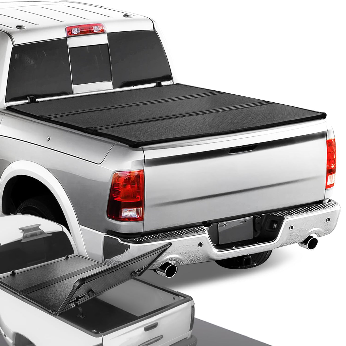 FITMENT - DNA MOTORING Hard Tri-Fold Tonneau Cover Compatible with 09-18 Dodge Ram 1500; Compatible with 19-22 Ram 1500 Classic; Compatible with 10-22 Dodge Ram 2500 3500; Fit Model with 6.5Ft Fleetside Short Beds; Without Bed Rail Storage Without RamBox | PLUG & PLAY - Easy to install with included clamps. Adjustable tension for the perfect fit. Less than 70 lbs weight to help to save gas but strong and durable. Note: vehicles with a bedliner installed may require modifications to install this product. | INCREASE SPEED & SAVE GAS - Increases trucks aerodynamics at speed. Gas saving benefit from a covered bed. Locking strap to secure cover while folded up and driving. Rubberized edges to seal. | DURABLE MATERIAL - Black powder coated aluminum plating and high quality fiberglass reinforced plastic, with double layer PVC and UV protection. Powerful frames and clamps built to support unshakeable stability, Supports up to 367lbs. | GREAT EXPERIENCE - New upgrade symmetrical shaft design tonneau cover, 117% secure dust-proof and snow-proof trunk. Extra coating to help prevent scratches & dents for superior protection in some extreme environments.
