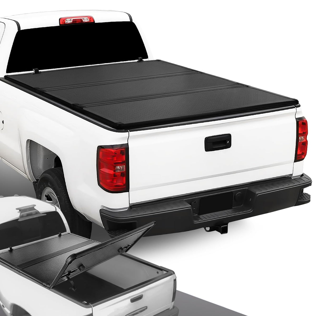 FITMENT - DNA MOTORING Hard Tri-Fold Tonneau Cover Compatible with 14-18 Chevy Silverado 1500 with 8Ft Bed / 15-18 Silverado 2500HD 3500HD with 8Ft Bed; Compatible with 14-18 GMC Sierra 1500 with 8Ft Bed / 15-18 Sierra 2500HD 3500HD with 8Ft Bed; Fits Fleetside / Styleside Models Only | PLUG & PLAY - Easy to install with included clamps. Adjustable tension for the perfect fit. Less than 70 lbs weight to help to save gas but strong and durable. Note: vehicles with a bedliner installed may require modifications to install this product. | INCREASE SPEED & SAVE GAS - Increases trucks aerodynamics at speed. Gas saving benefit from a covered bed. Locking strap to secure cover while folded up and driving. Rubberized edges to seal. | DURABLE MATERIAL - Black powder coated aluminum plating and high quality fiberglass reinforced plastic, with double layer PVC and UV protection. Powerful frames and clamps built to support unshakeable stability, Supports up to 374lbs. | GREAT EXPERIENCE - New upgrade symmetrical shaft design tonneau cover, 124% secure dust-proof and snow-proof trunk. Extra coating to help prevent scratches & dents for superior protection in some extreme environments.