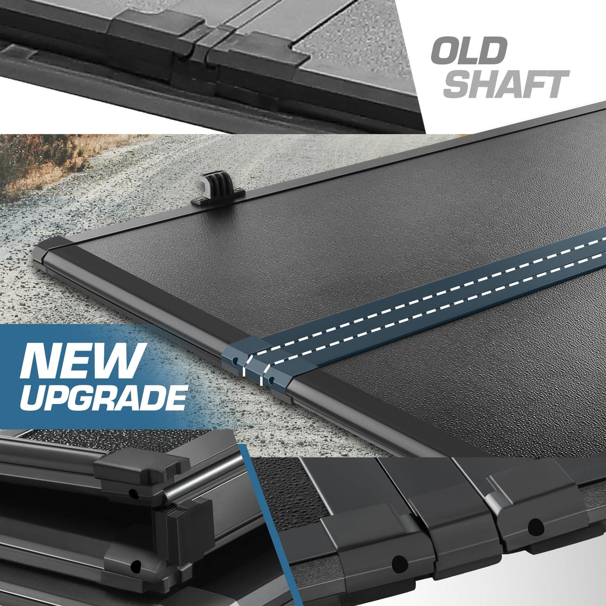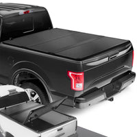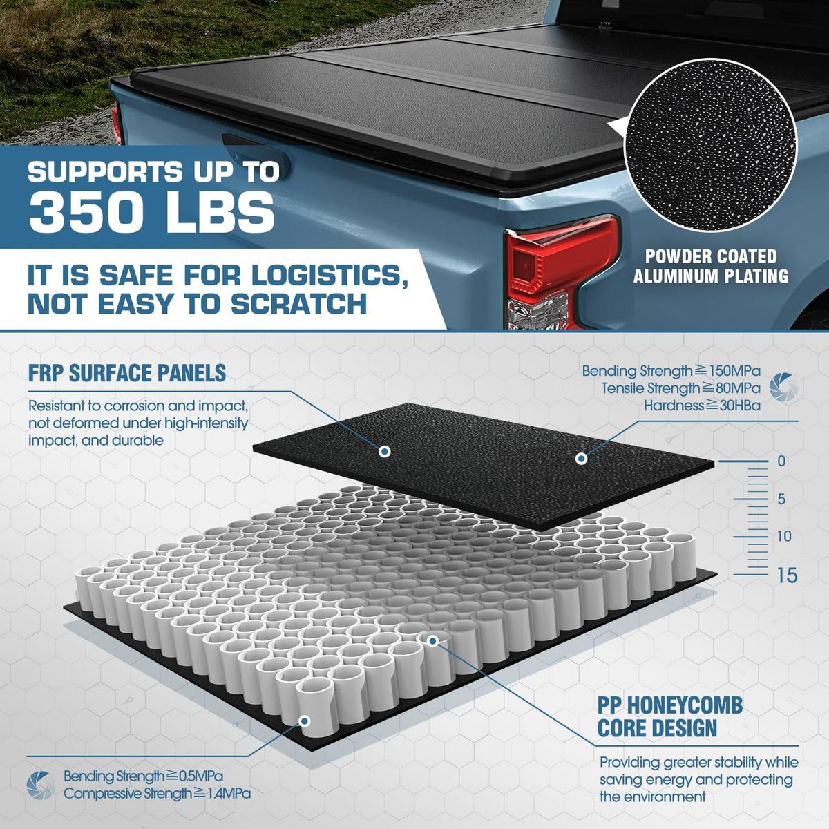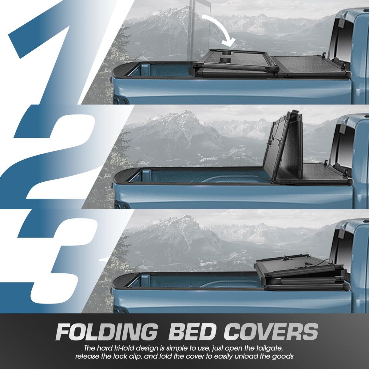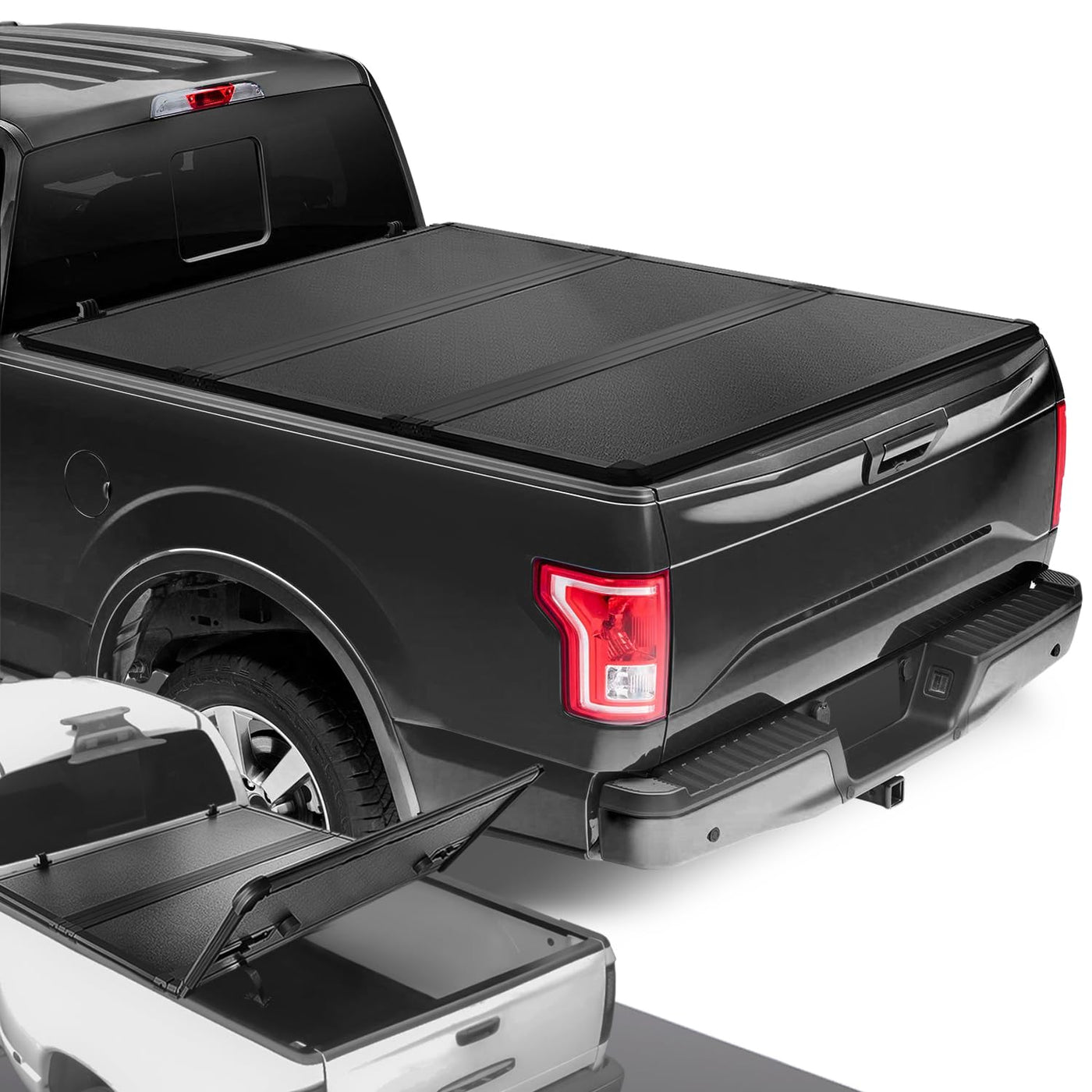 FITMENT - DNA MOTORING Hard Tri-Fold Tonneau Cover Compatible with 2015-2024 Ford F-150 with 5.5Ft Fleetside Bed | PLUG & PLAY - Easy to install with included clamps. Adjustable tension for the perfect fit. Less than 70 lbs weight to help to save gas but strong and durable. Note: vehicles with a bedliner installed may require modifications to install this product. | INCREASE SPEED & SAVE GAS - Increases trucks aerodynamics at speed. Gas saving benefit from a covered bed. Locking strap to secure cover while folded up and driving. Rubberized edges to seal. | DURABLE MATERIAL - Black powder coated aluminum plating and high quality fiberglass reinforced plastic, with double layer PVC and UV protection. Powerful frames and clamps built to support unshakeable stability, Supports up to 360lbs. | GREAT EXPERIENCE - New upgrade symmetrical shaft design tonneau cover, 100% secure dust-proof and snow-proof trunk. Extra coating to help prevent scratches & dents for superior protection in some extreme environments.