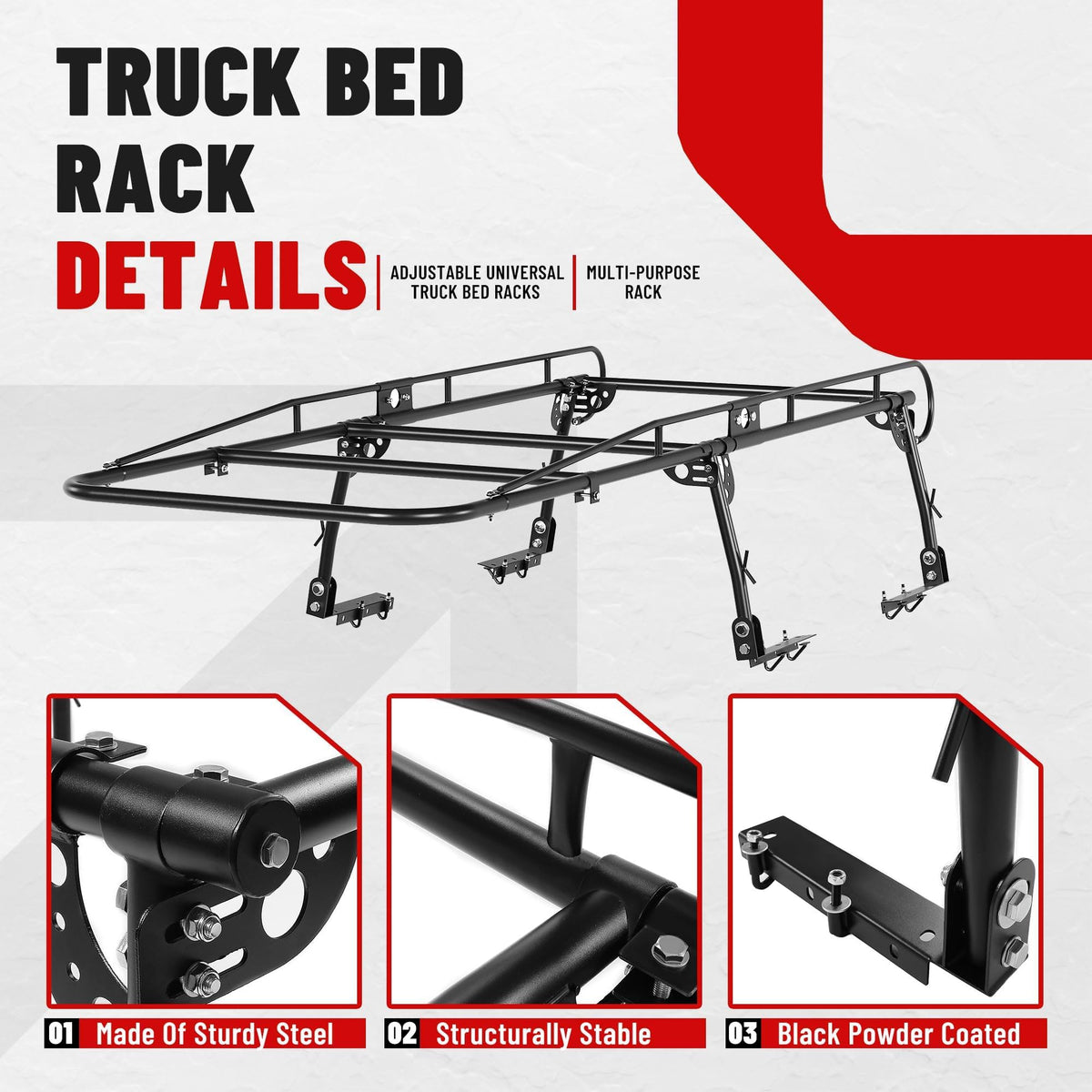 Fitment: Adjustable rack fits different sizes of beds, which adds more utility to your truck. This durable truck rack can carry heavy lumber and bulky steel on the back of a pickup truck. Dimensions: 55-1/8''(W) x 139-5/8''(L) x 32-1/4''(H) Features: Made of automotive grade high-quality steel materials, stable and reliable, not easy to wear and age. Heavy duty powder-coat paint resists rust Max Load: 1000 lbs. Adjustable center brace for even load distribution. Over cab design for long cargo to be loaded Adjustable Design: Multiple tie-down points for straps, bungees, and ropes. Adjustable center brace for even load distribution. Adjustable leg and feet for complete customization. And the width can be adjusted to fit more sizes of carriages Package&Installation: You will receive 2 packages for your purchase. The racks universal design fits both long and short bed pick-up trucks and can be installed ''no-drill''. Easy to unload when not in use. All necessary installation hardware and instructions are included