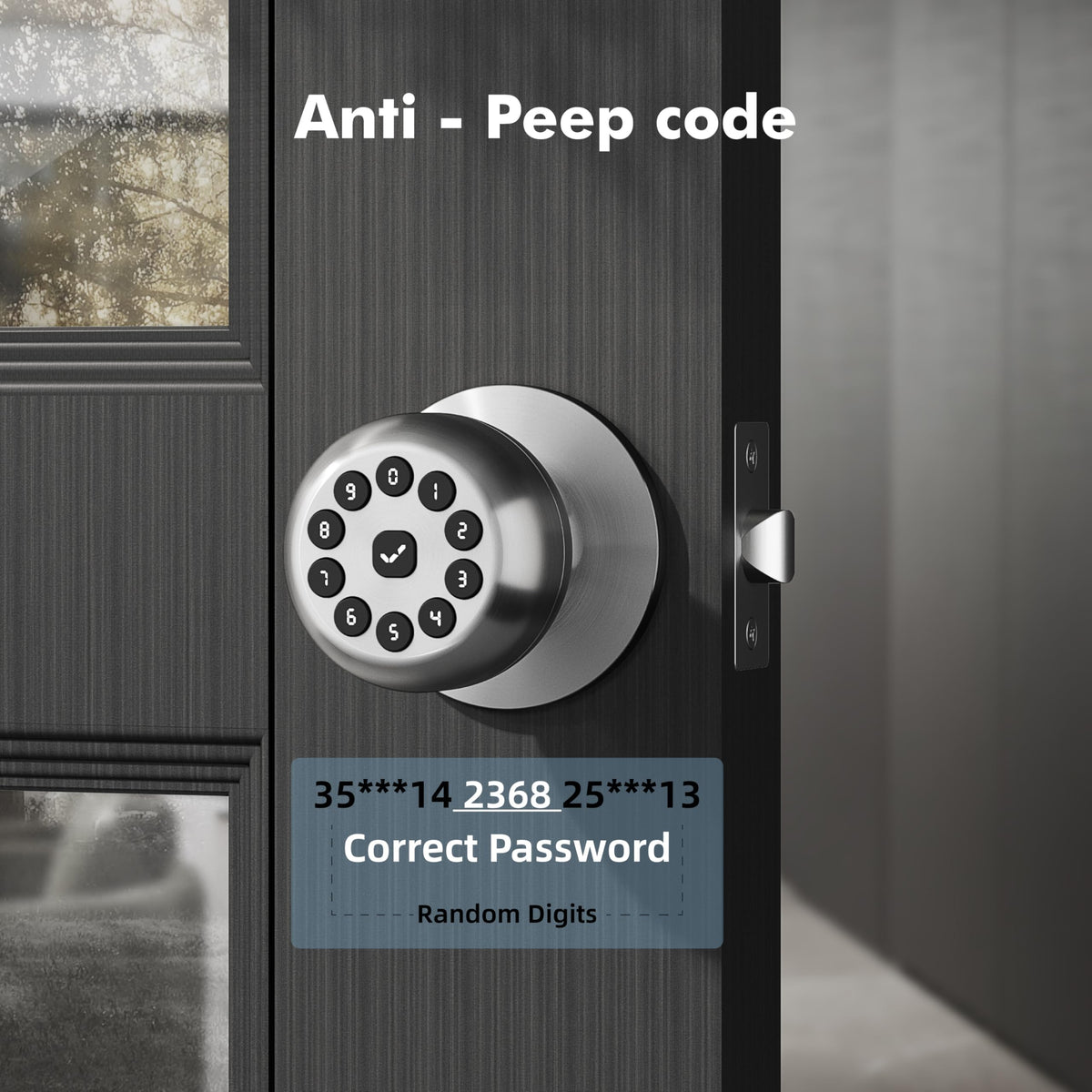 Q: What safety features does the EUERTE Smart Door Knob offer?A: This smart door knob includes several safety features such as a 5-second auto-lock function that secures your door after a set period, and an anti-peep passcode option that allows you to enter random digits before or after your actual code, enhancing security against unauthorized access.