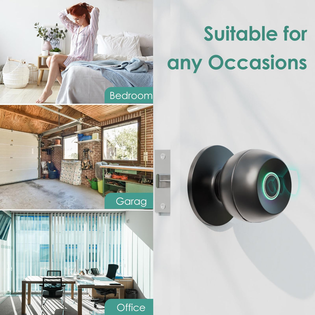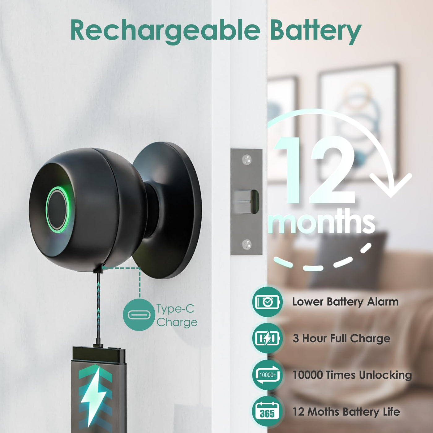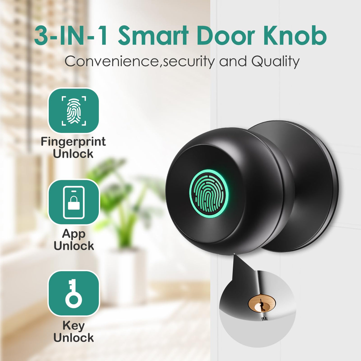 Fingerprint Door Lock,Smart Door Knob,Biometric Door Lock,Thumbprint Door Knob With App Control, Key, Great For Bedroom, Front Door, Apartment, Office, Garage, Cloakroom Black