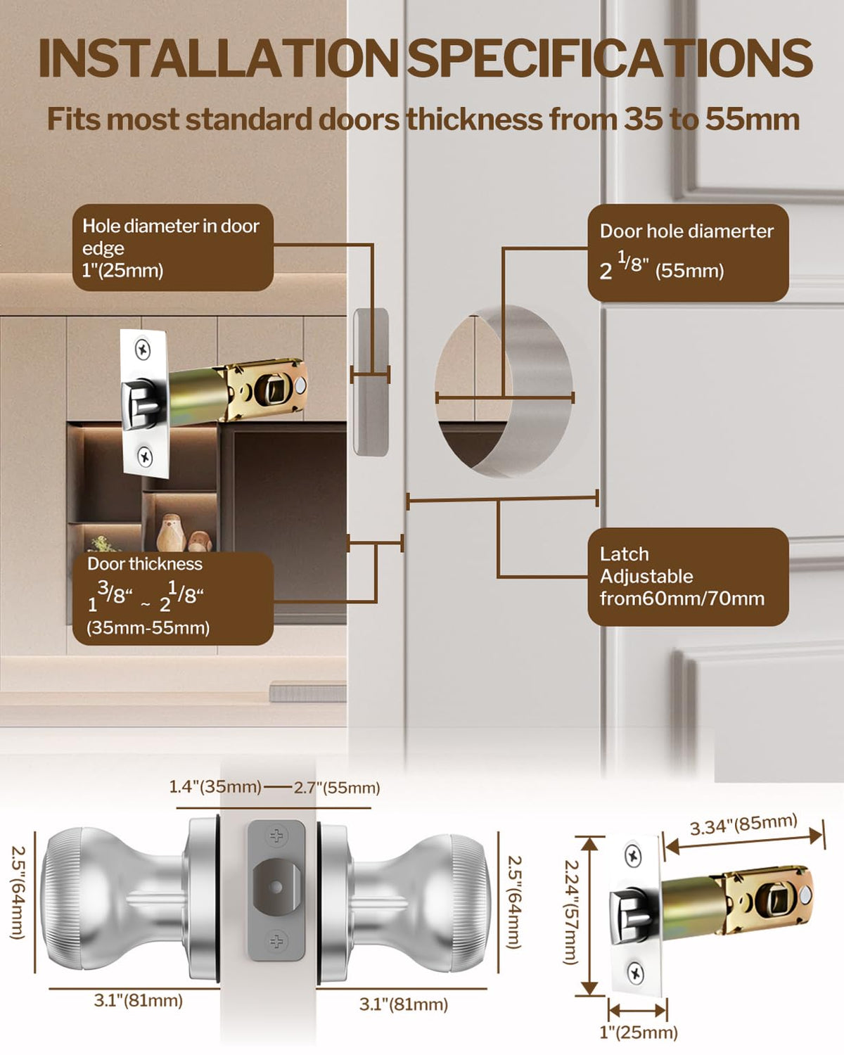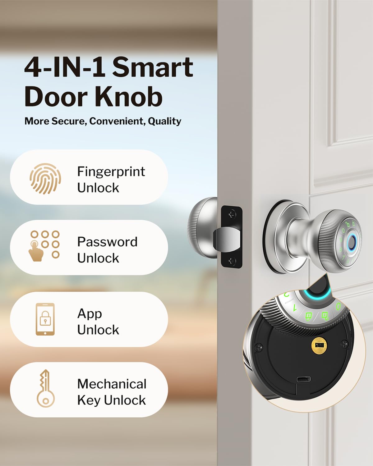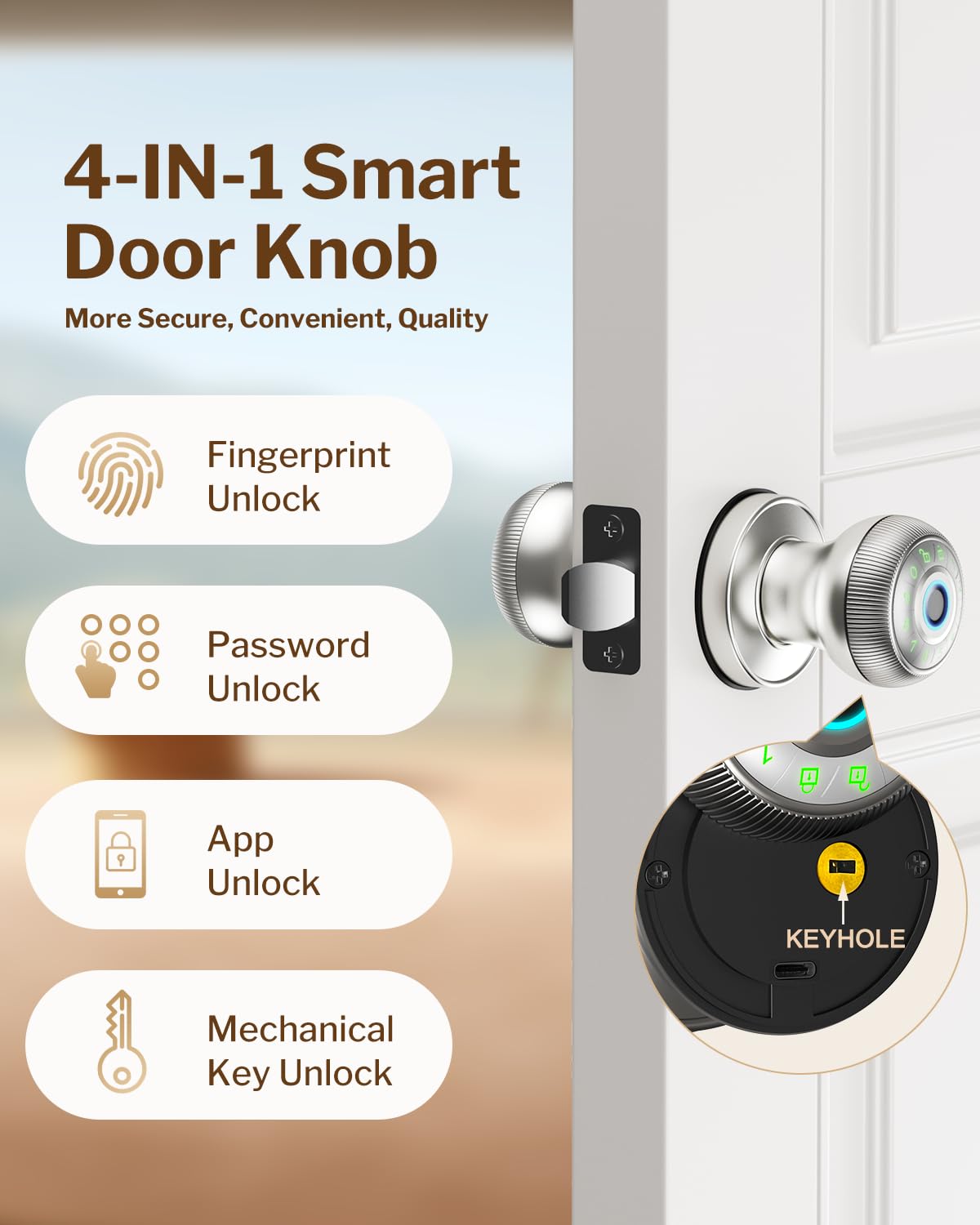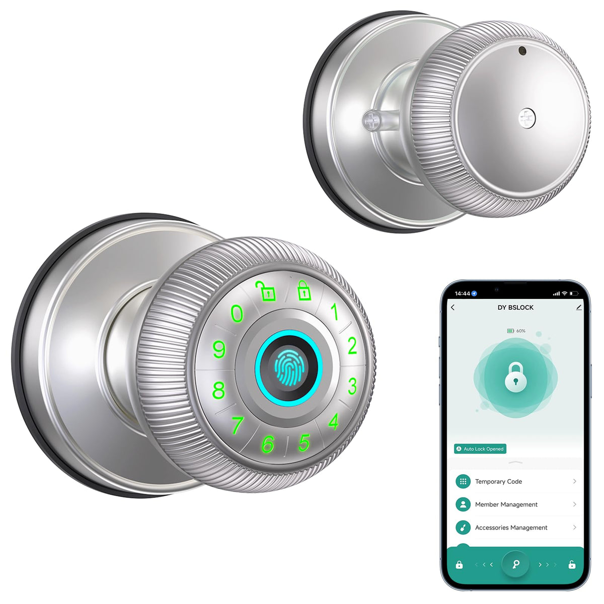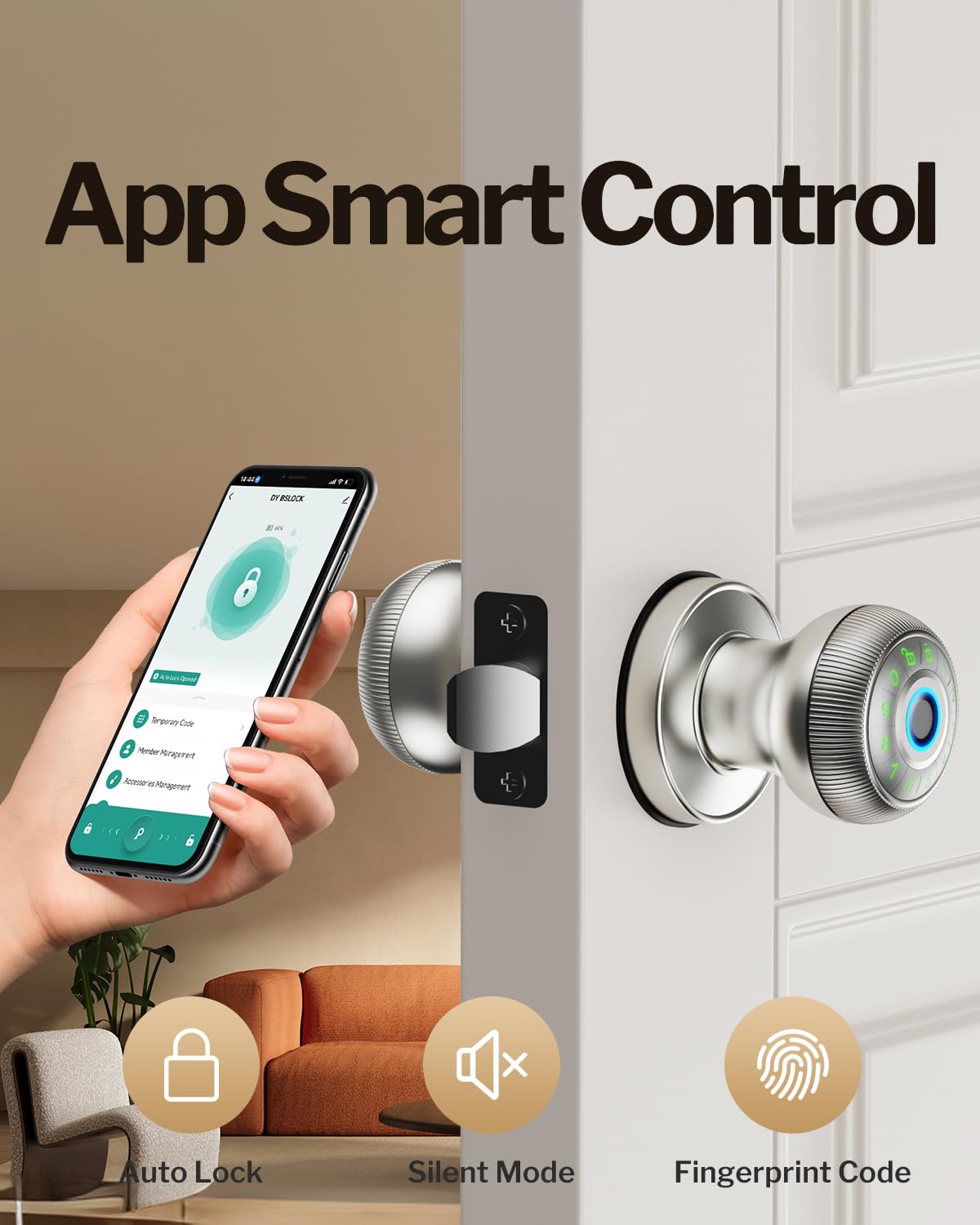 Fingerprint Door Lock - Smart Door Knob With Passcode Keypad, Finger Print Biometric Door Knobs & App Control, Keyless Smart Door Lock For Apartment Bedroom Hotel Office (Silvery)
